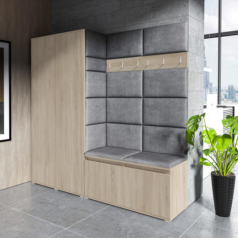 Předsíňová stěna AMI 8, je moderní a praktický prvek do vstupních prostor vašeho domu. Předsíňová stěna obsahuje patnáct čalouněných panelů, které se montují přímo na stěnu za pomoci lepidla. Potah botníku je tkanina TRINITY, která je měkká a příjemná na dotek. Jedná se o velurovou tkaninu. Předsíňová stěna se skládá z několika částí.