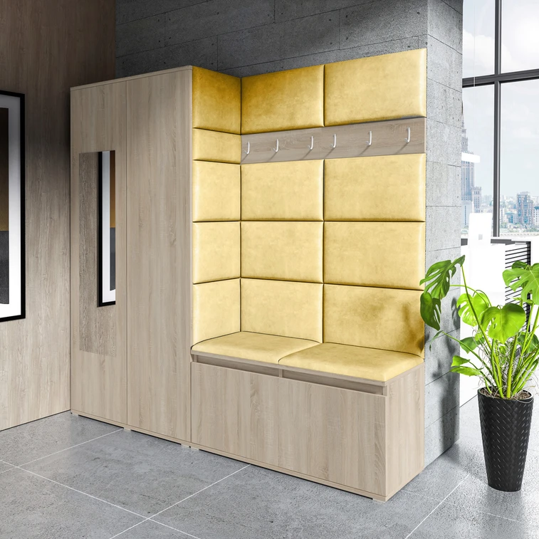 Předsíňová stěna AMI 8, je moderní a praktický prvek do vstupních prostor vašeho domu. Předsíňová stěna obsahuje patnáct čalouněných panelů, které se montují přímo na stěnu za pomoci lepidla. Potah botníku je tkanina TRINITY, která je měkká a příjemná na dotek. Jedná se o velurovou tkaninu. Předsíňová stěna se skládá z několika částí.