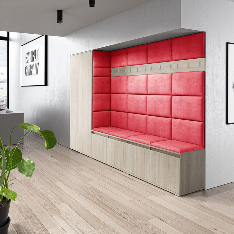 Předsíňová stěna AMI 9, je moderní a praktický prvek do vstupních prostor vašeho domu. Předsíňová stěna obsahuje dvacet pět čalouněných panelů, které se montují přímo na stěnu za pomoci lepidla. Potah botníku je tkanina TRINITY, která je měkká a příjemná na dotek. Jedná se o velurovou tkaninu. Předsíňová stěna se skládá z několika částí.