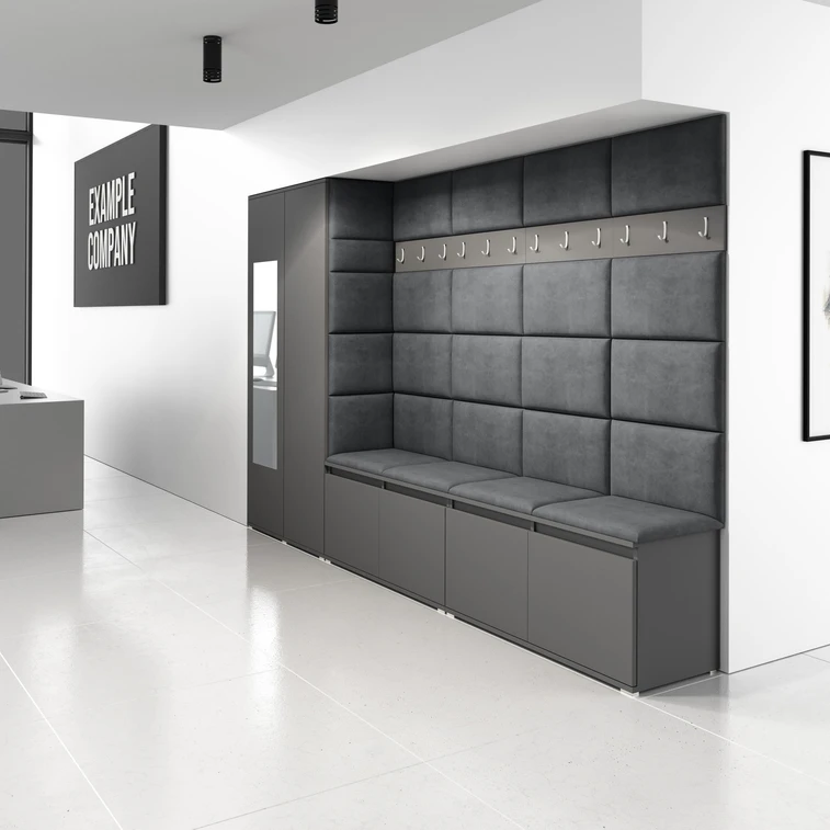 Předsíňová stěna AMI 9, je moderní a praktický prvek do vstupních prostor vašeho domu. Předsíňová stěna obsahuje dvacet pět čalouněných panelů, které se montují přímo na stěnu za pomoci lepidla. Potah botníku je tkanina TRINITY, která je měkká a příjemná na dotek. Jedná se o velurovou tkaninu. Předsíňová stěna se skládá z několika částí.