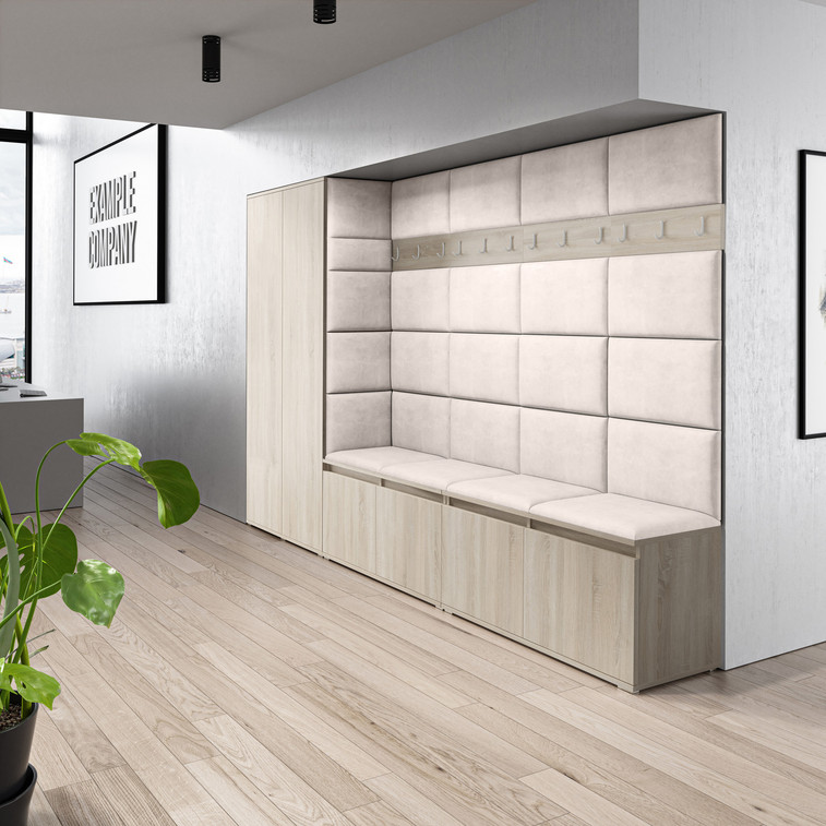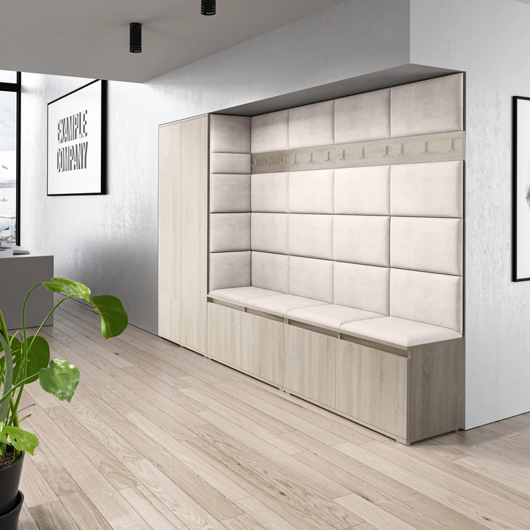 Předsíňová stěna AMI 9, je moderní a praktický prvek do vstupních prostor vašeho domu. Předsíňová stěna obsahuje dvacet pět čalouněných panelů, které se montují přímo na stěnu za pomoci lepidla. Potah botníku je tkanina TRINITY, která je měkká a příjemná na dotek. Jedná se o velurovou tkaninu. Předsíňová stěna se skládá z několika částí.
