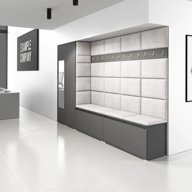 Předsíňová stěna AMI 9, je moderní a praktický prvek do vstupních prostor vašeho domu. Předsíňová stěna obsahuje dvacet pět čalouněných panelů, které se montují přímo na stěnu za pomoci lepidla. Potah botníku je tkanina TRINITY, která je měkká a příjemná na dotek. Jedná se o velurovou tkaninu. Předsíňová stěna se skládá z několika částí.