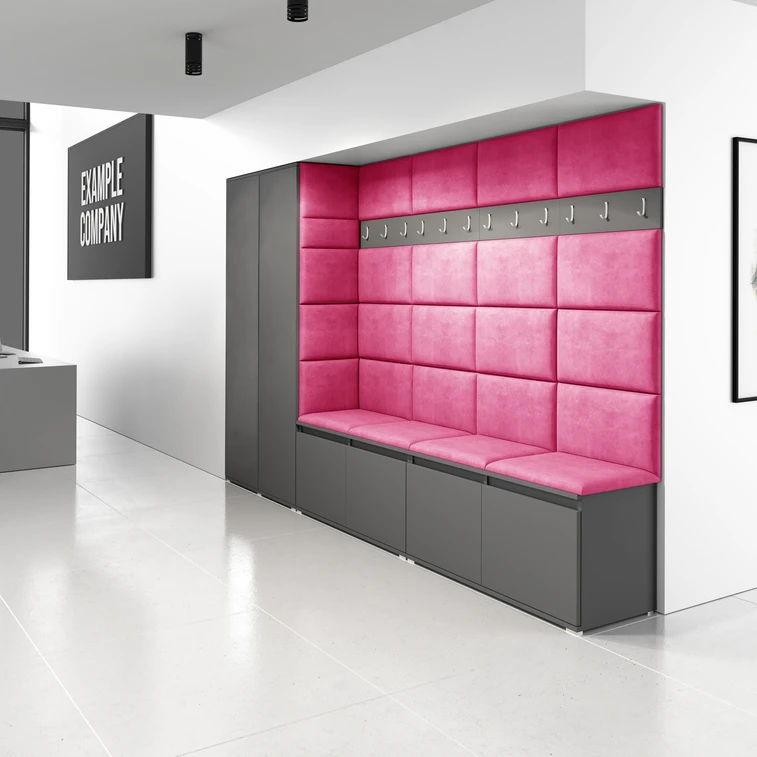 Předsíňová stěna AMI 9, je moderní a praktický prvek do vstupních prostor vašeho domu. Předsíňová stěna obsahuje dvacet pět čalouněných panelů, které se montují přímo na stěnu za pomoci lepidla. Potah botníku je tkanina TRINITY, která je měkká a příjemná na dotek. Jedná se o velurovou tkaninu. Předsíňová stěna se skládá z několika částí.