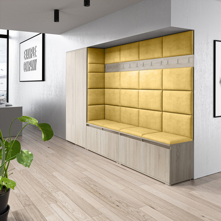 Předsíňová stěna AMI 9, je moderní a praktický prvek do vstupních prostor vašeho domu. Předsíňová stěna obsahuje dvacet pět čalouněných panelů, které se montují přímo na stěnu za pomoci lepidla. Potah botníku je tkanina TRINITY, která je měkká a příjemná na dotek. Jedná se o velurovou tkaninu. Předsíňová stěna se skládá z několika částí.