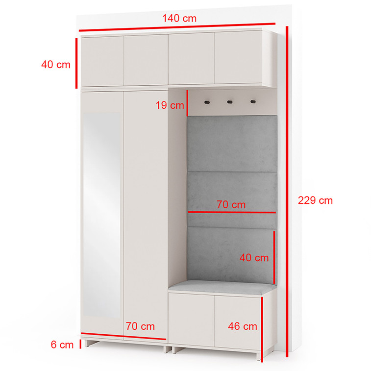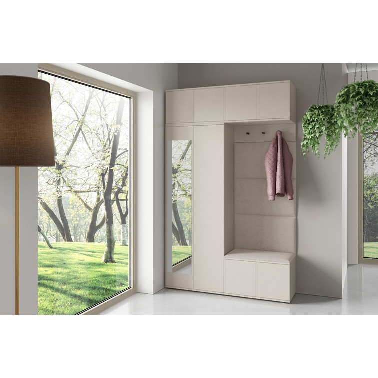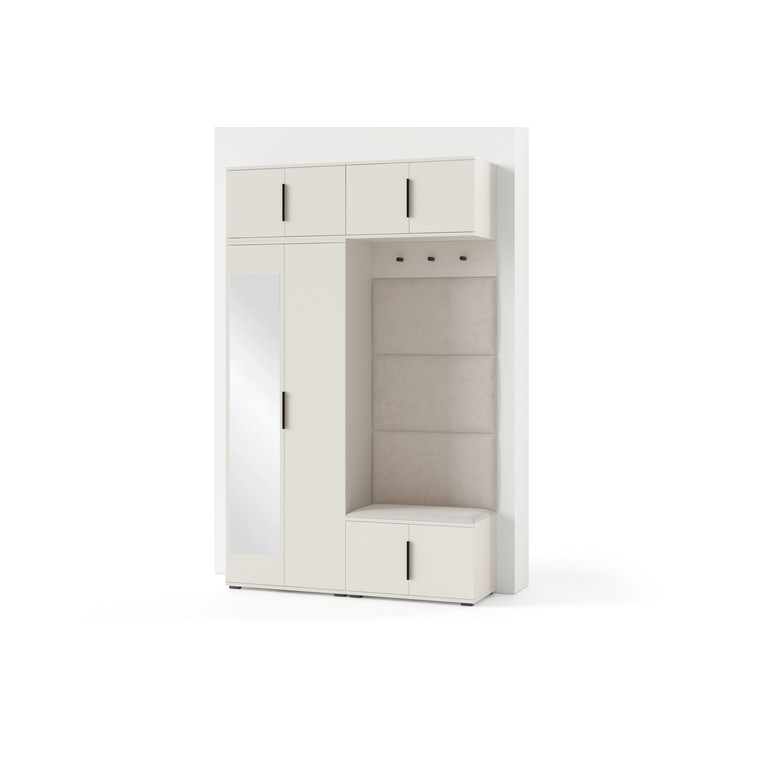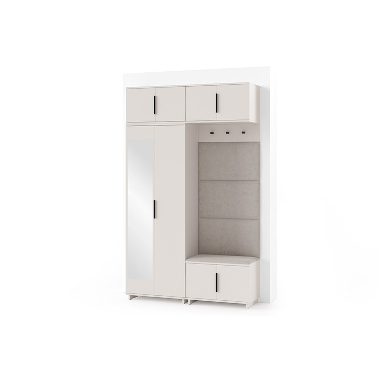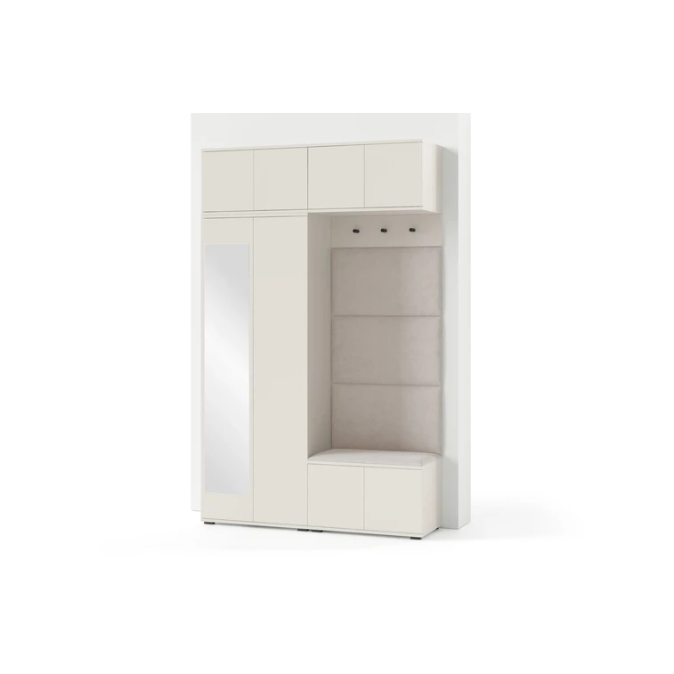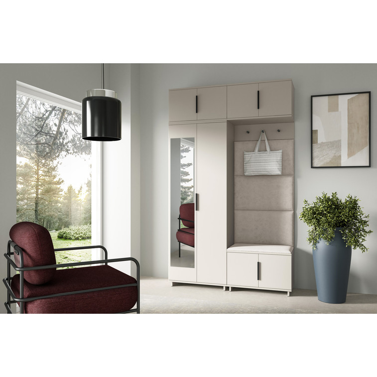 Je to praktický prvek do vstupních prostor vašeho domu. Předsíňová stěna obsahuje čalouněné panely, které se montují přímo na stěnu za pomoci lepidla. Potah panelů je tkanina Trinity. Předsíňová stěna se skládá z několika částí. Tato sada obsahuje: šatní skříň, nástavba, závěsná skříňka, botník, věšák, 4 panely.