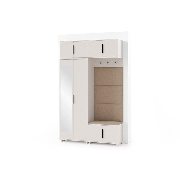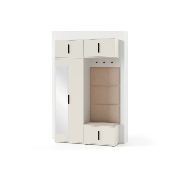 Je to praktický prvek do vstupních prostor vašeho domu. Předsíňová stěna obsahuje čalouněné panely, které se montují přímo na stěnu za pomoci lepidla. Potah panelů je tkanina Trinity. Předsíňová stěna se skládá z několika částí. Tato sada obsahuje: šatní skříň, nástavba, závěsná skříňka, botník, věšák, 4 panely.