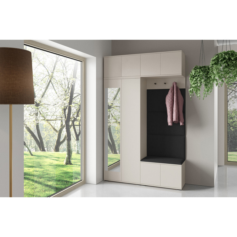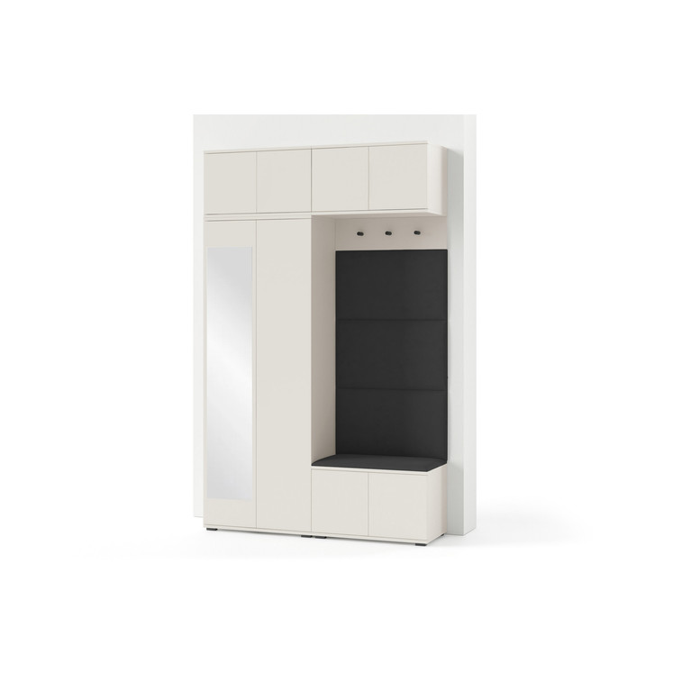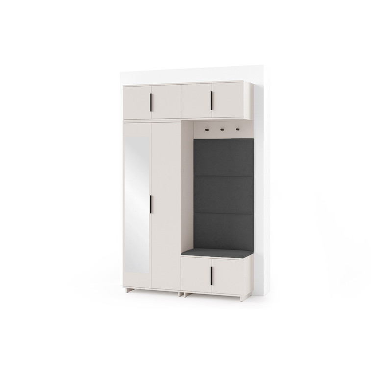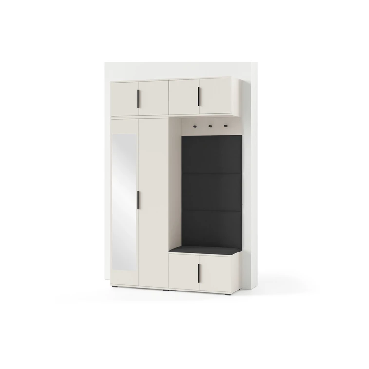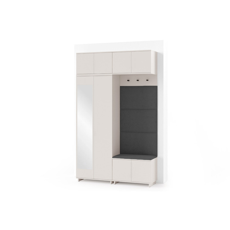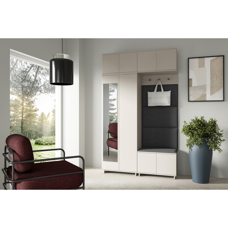 Je to praktický prvek do vstupních prostor vašeho domu. Předsíňová stěna obsahuje čalouněné panely, které se montují přímo na stěnu za pomoci lepidla. Potah panelů je tkanina Trinity. Předsíňová stěna se skládá z několika částí. Tato sada obsahuje: šatní skříň, nástavba, závěsná skříňka, botník, věšák, 4 panely.
