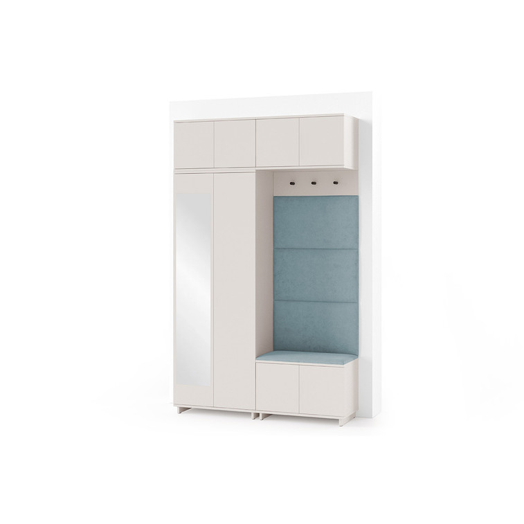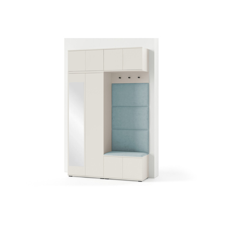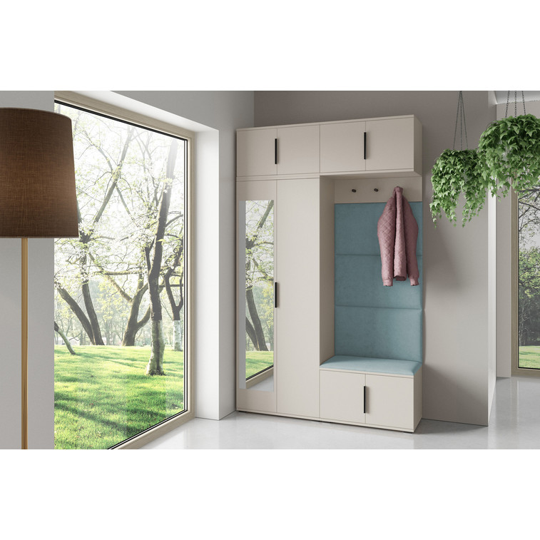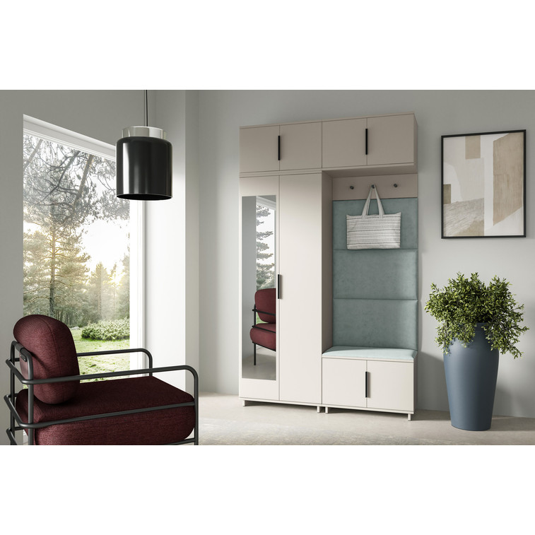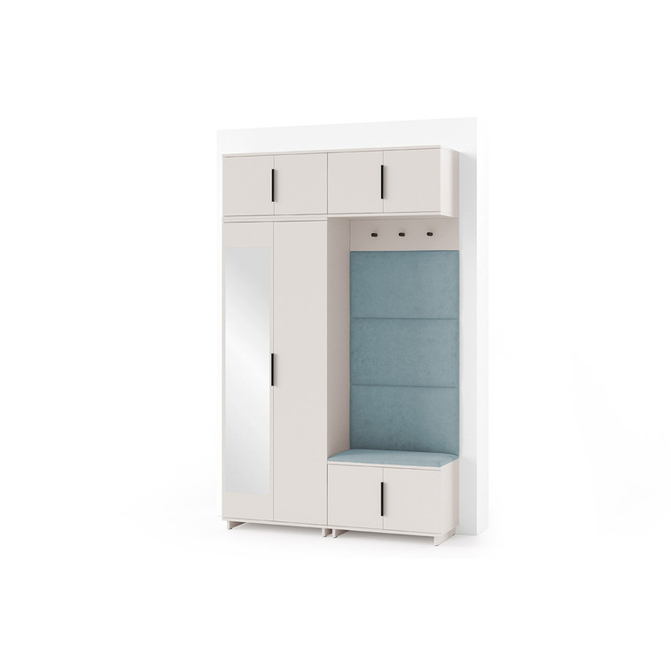Je to praktický prvek do vstupních prostor vašeho domu. Předsíňová stěna obsahuje čalouněné panely, které se montují přímo na stěnu za pomoci lepidla. Potah panelů je tkanina Trinity. Předsíňová stěna se skládá z několika částí. Tato sada obsahuje: šatní skříň, nástavba, závěsná skříňka, botník, věšák, 4 panely.