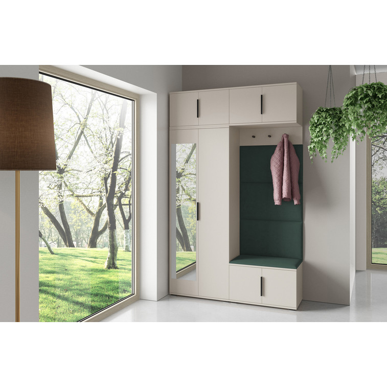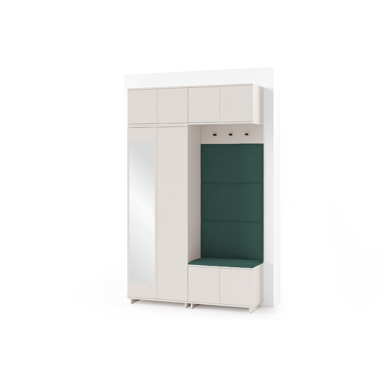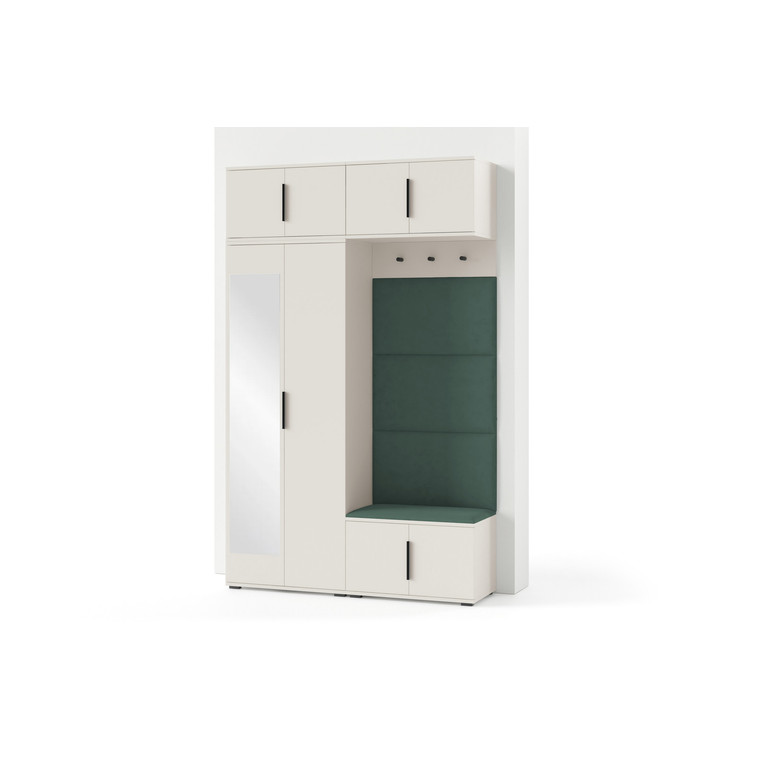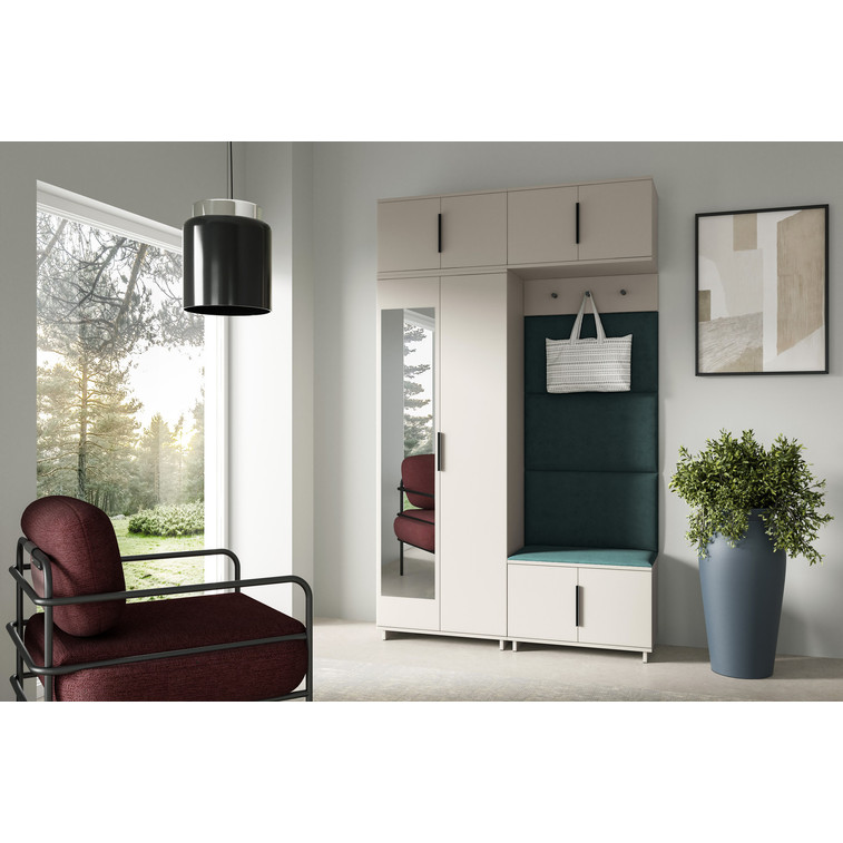 Je to praktický prvek do vstupních prostor vašeho domu. Předsíňová stěna obsahuje čalouněné panely, které se montují přímo na stěnu za pomoci lepidla. Potah panelů je tkanina Trinity. Předsíňová stěna se skládá z několika částí. Tato sada obsahuje: šatní skříň, nástavba, závěsná skříňka, botník, věšák, 4 panely.
