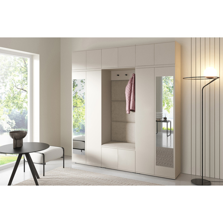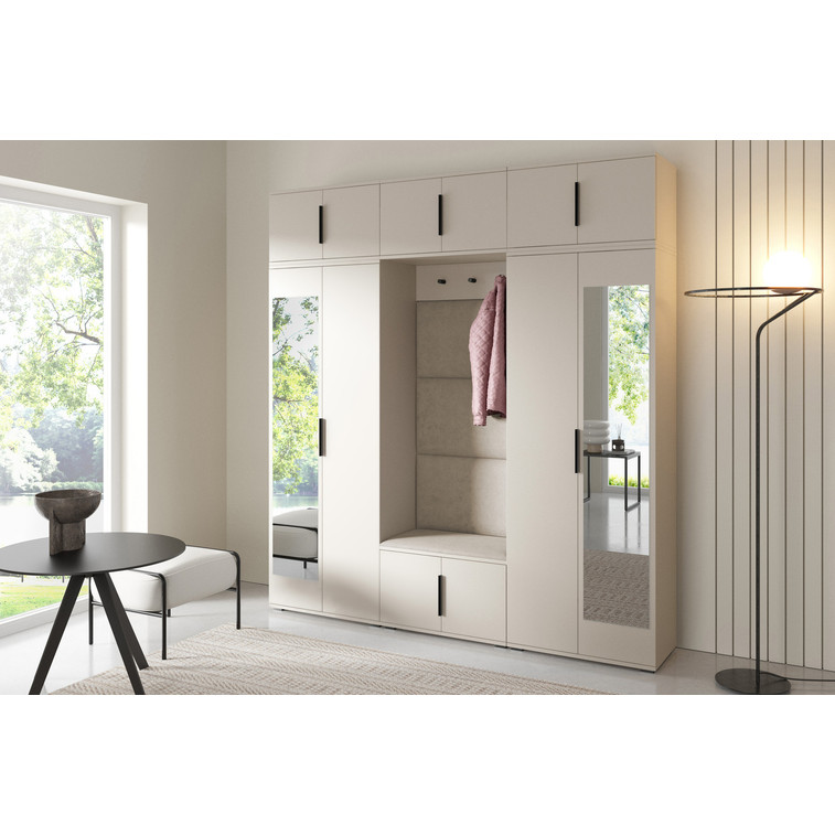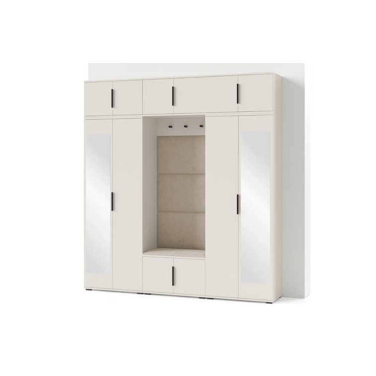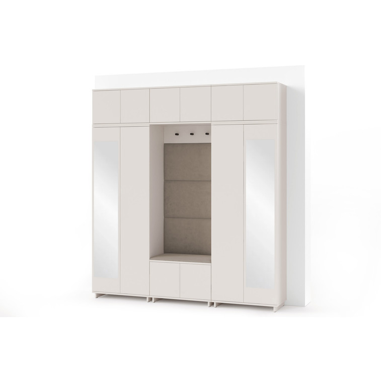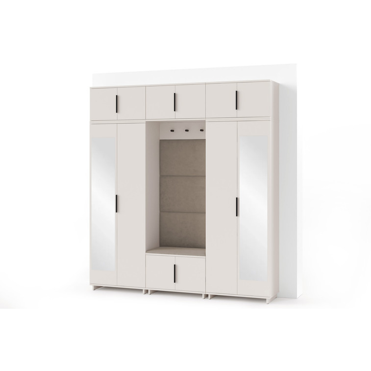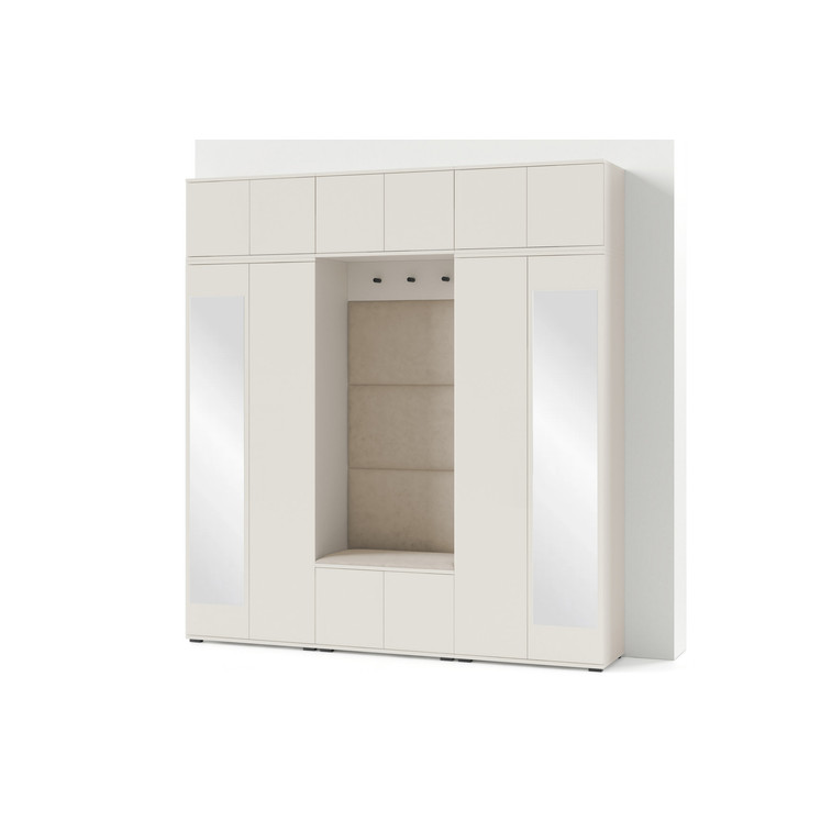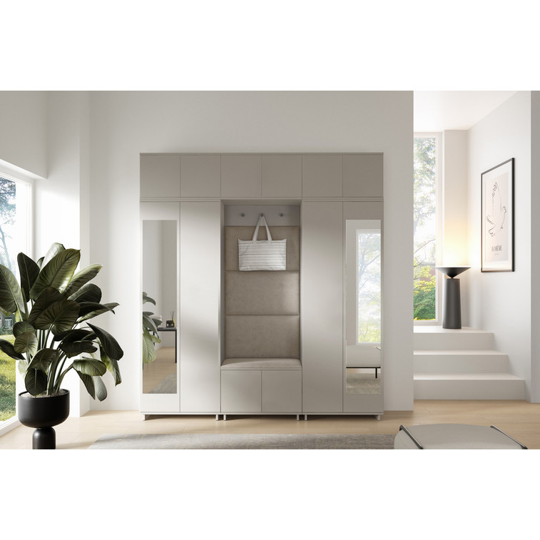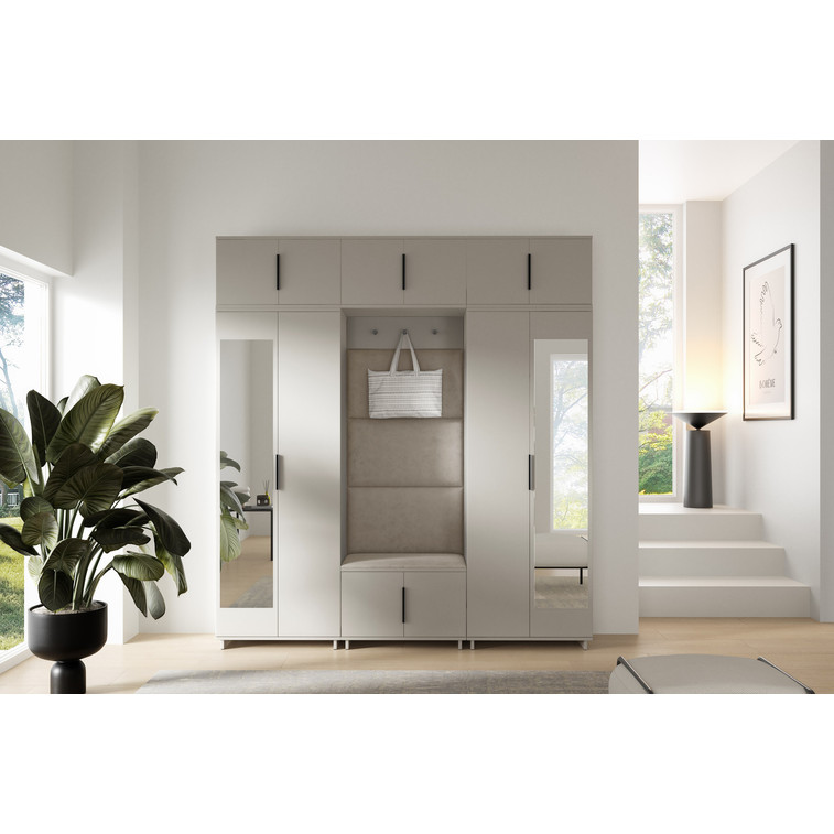 Je to praktický prvek do vstupních prostor vašeho domu. Předsíňová stěna obsahuje čalouněné panely, které se montují přímo na stěnu za pomoci lepidla. Potah panelů je tkanina Trinity. Předsíňová stěna se skládá z několika částí. Tato sada obsahuje: 2x šatní skříň, 2x nástavba, 1x závěsná skříňka, 1x botník, věšák, 4 panely.