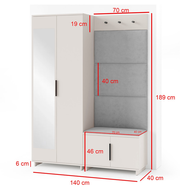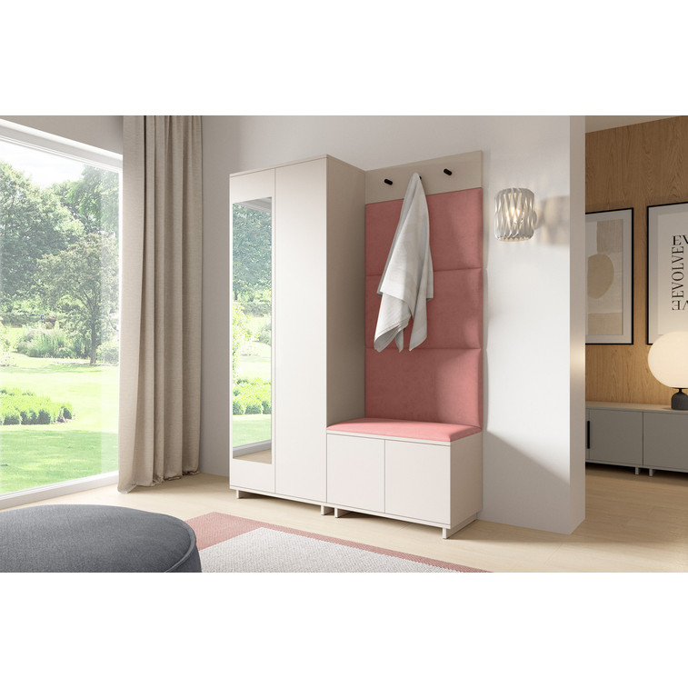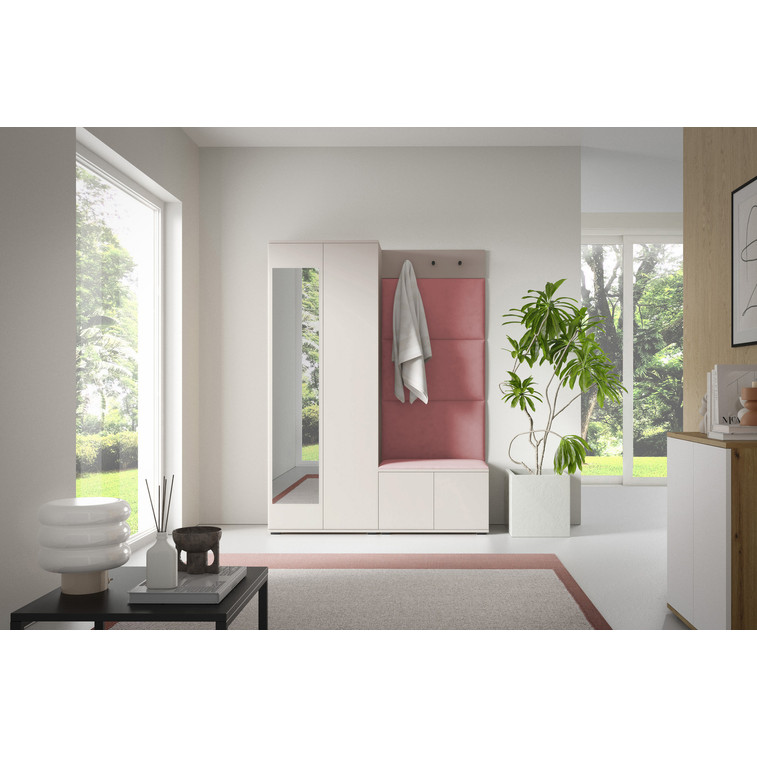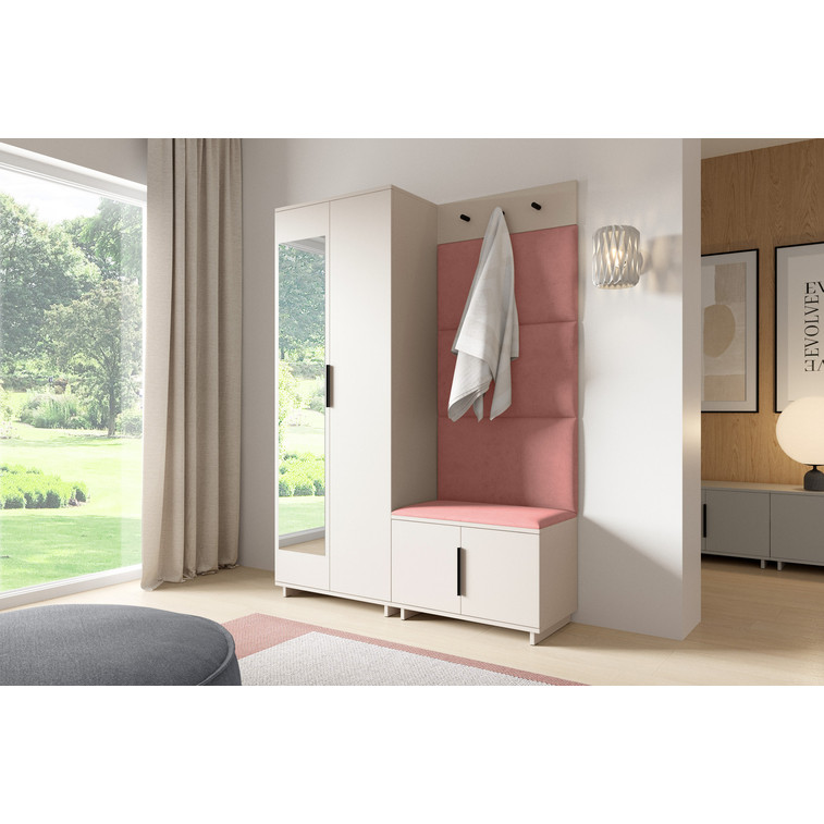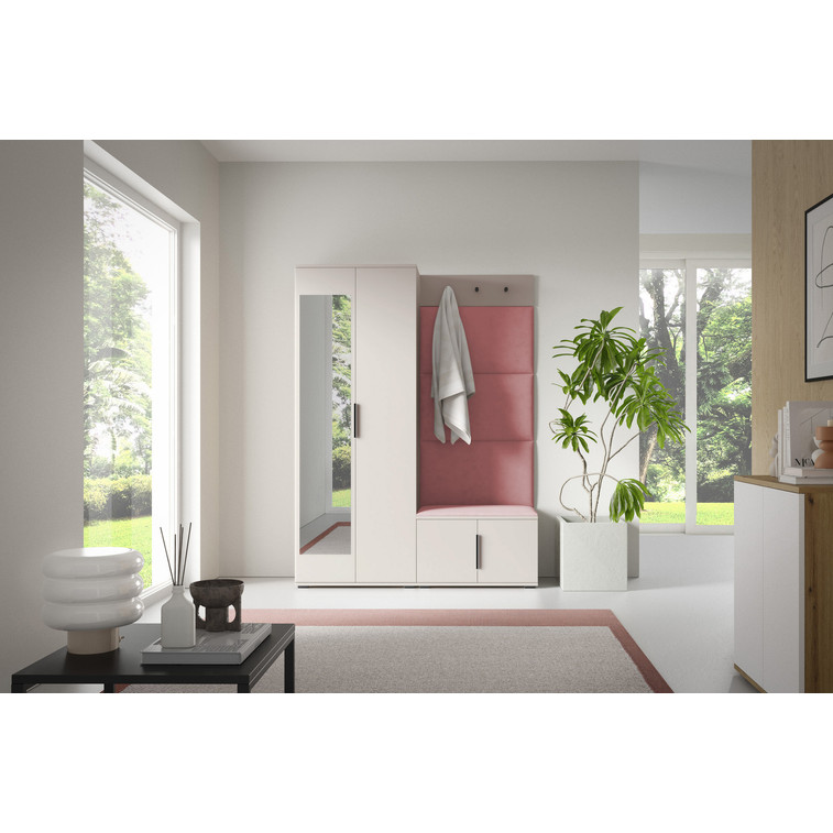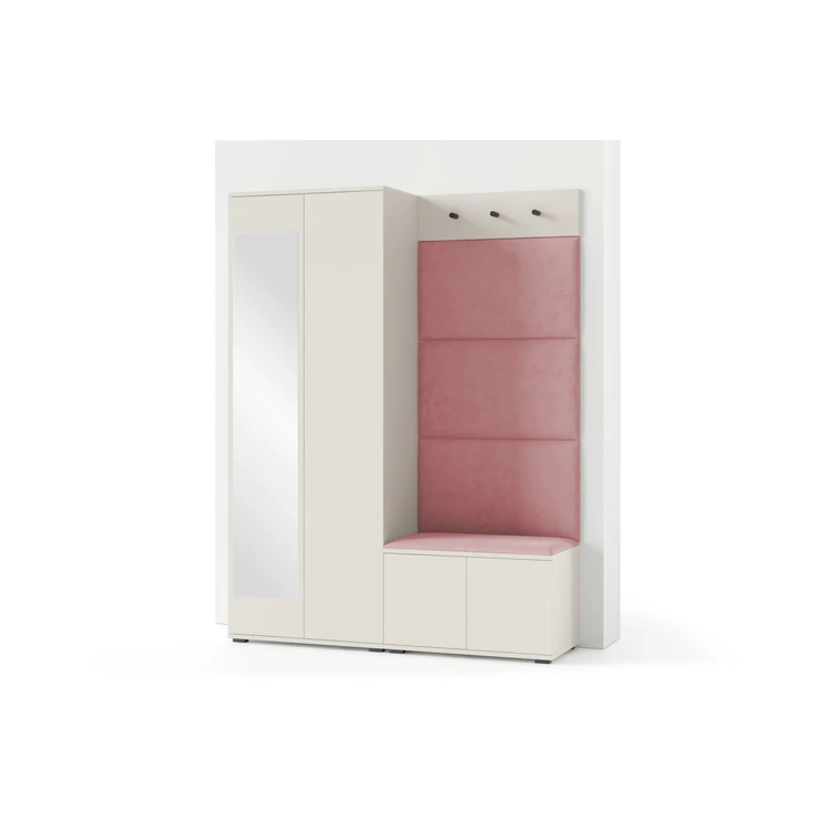 Je to praktický prvek do vstupních prostor vašeho domu. Předsíňová stěna obsahuje čalouněné panely, které se montují přímo na stěnu za pomoci lepidla. Potah panelů je tkanina Trinity. Předsíňová stěna se skládá z několika částí. Tato sada obsahuje: 1x šatní skříň, 1x botník, věšák, 4 panely.