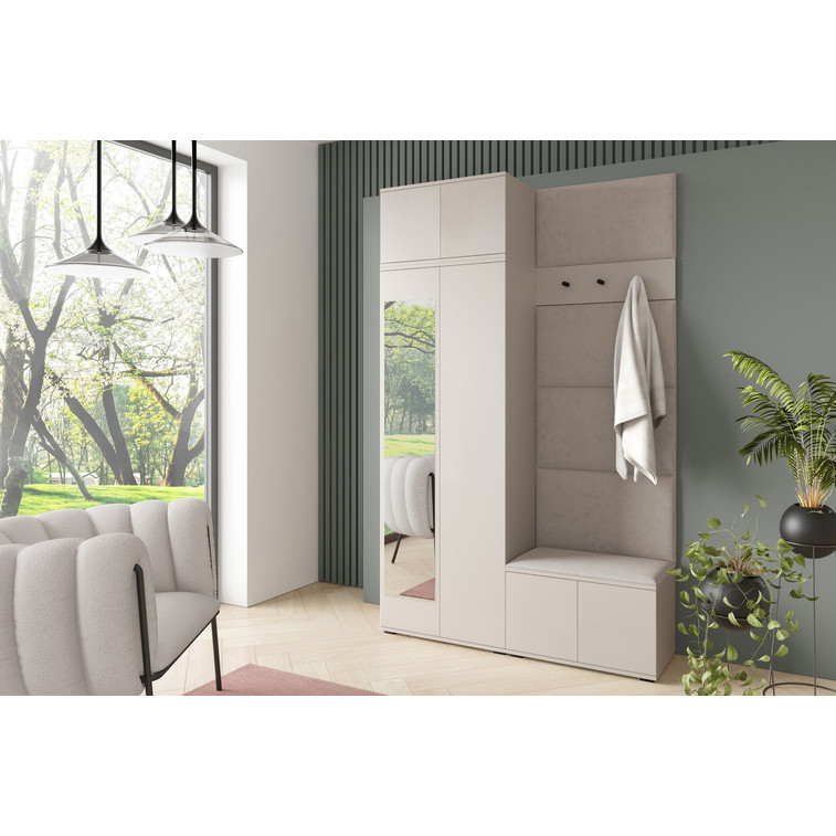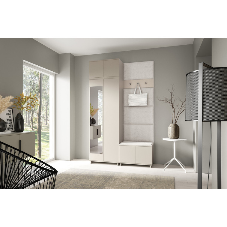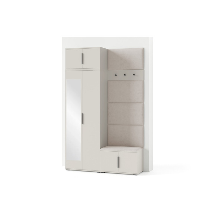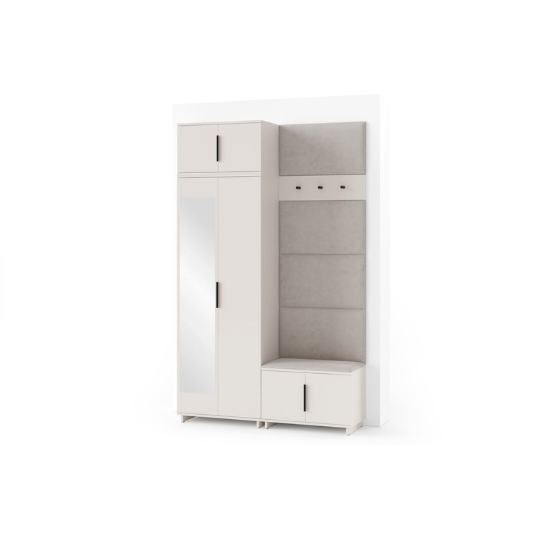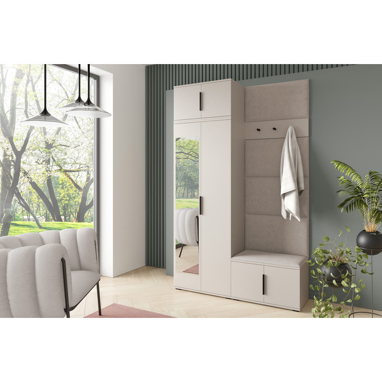 Je to praktický prvek do vstupních prostor vašeho domu. Předsíňová stěna obsahuje čalouněné panely, které se montují přímo na stěnu za pomoci lepidla. Potah panelů je tkanina Trinity. Předsíňová stěna se skládá z několika částí. Tato sada obsahuje: 1x šatní skříň, 1x nástavba, 1x botník, věšák, 5 panelů.