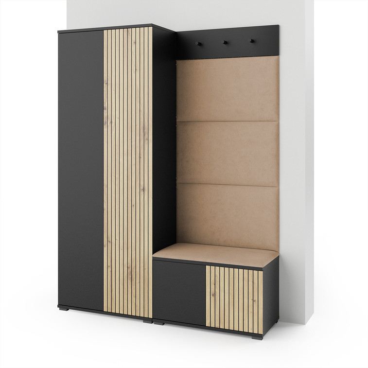 Moderní předsíňová stěna je praktický prvek do vstupních prostor vašeho domu. Předsíňová stěna obsahuje čalouněné panely, které se montují přímo na stěnu za pomoci lepidla. Potah panelů je tkanina Trinity. Bezúchytková čela dvířek zajišťují pohodlné používání - systém TIP-ON  otvírá se jemným zatlačením na čelo dvířek.