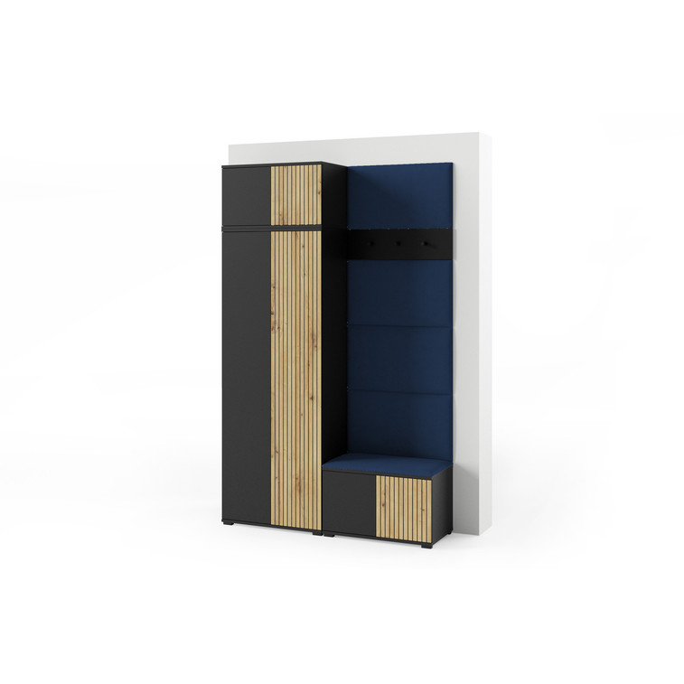 Moderní předsíňová stěna je praktický prvek do vstupních prostor vašeho domu. Předsíňová stěna obsahuje čalouněné panely, které se montují přímo na stěnu za pomoci lepidla. Potah panelů je tkanina Trinity. Bezúchytková čela dvířek zajišťují pohodlné používání - systém TIP-ON  otvírá se jemným zatlačením na čelo dvířek.