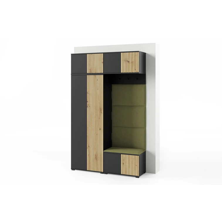 Moderní předsíňová stěna je praktický prvek do vstupních prostor vašeho domu. Předsíňová stěna obsahuje čalouněné panely, které se montují přímo na stěnu za pomoci lepidla. Potah panelů je tkanina Trinity. Bezúchytková čela dvířek zajišťují pohodlné používání - systém TIP-ON  otvírá se jemným zatlačením na čelo dvířek.
