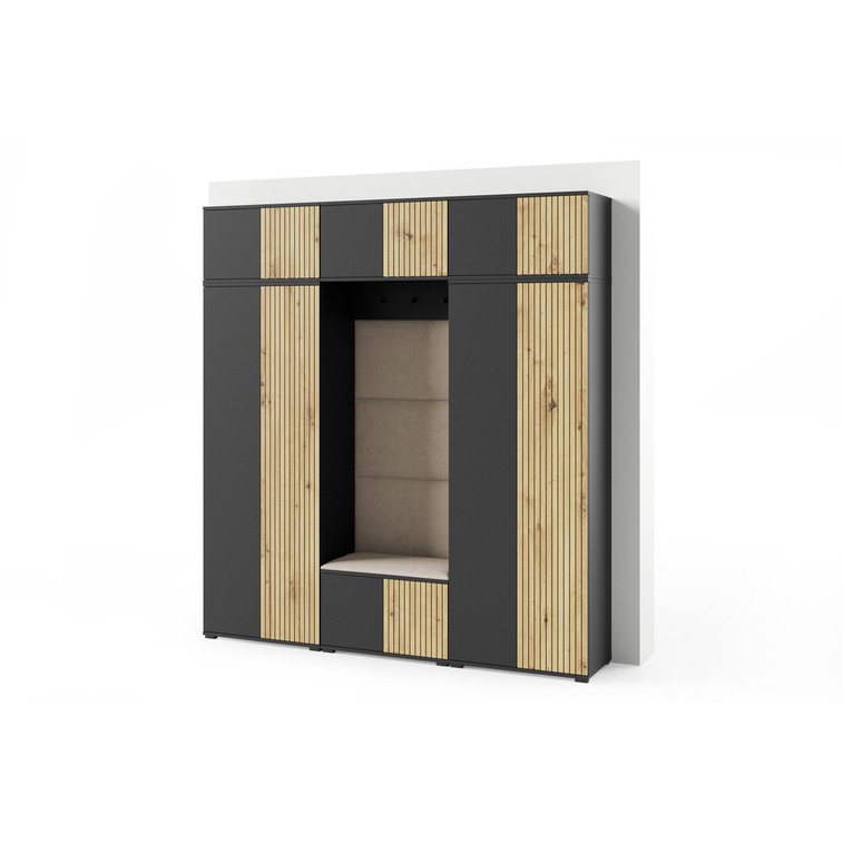 Moderní předsíňová stěna je praktický prvek do vstupních prostor vašeho domu. Předsíňová stěna obsahuje čalouněné panely, které se montují přímo na stěnu za pomoci lepidla. Potah panelů je tkanina Trinity. Bezúchytková čela dvířek zajišťují pohodlné používání - systém TIP-ON  otvírá se jemným zatlačením na čelo dvířek.