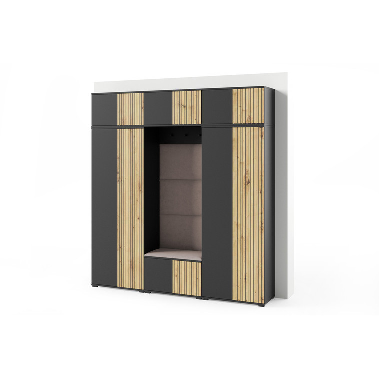 Moderní předsíňová stěna je praktický prvek do vstupních prostor vašeho domu. Předsíňová stěna obsahuje čalouněné panely, které se montují přímo na stěnu za pomoci lepidla. Potah panelů je tkanina Trinity. Bezúchytková čela dvířek zajišťují pohodlné používání - systém TIP-ON otvírá se jemným zatlačením na čelo dvířek.