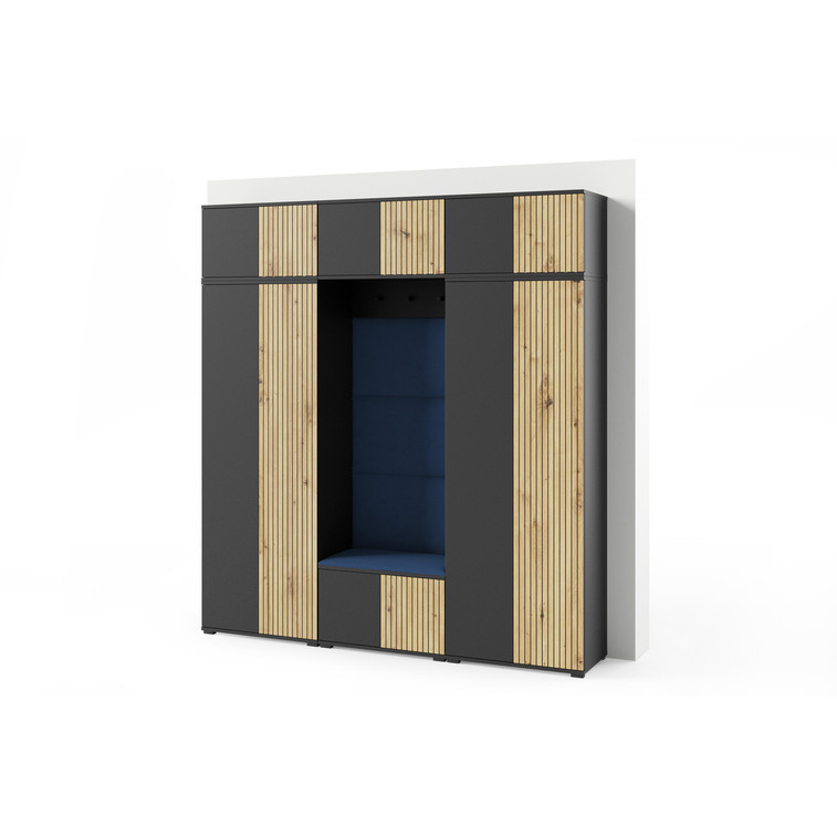 Moderní předsíňová stěna je praktický prvek do vstupních prostor vašeho domu. Předsíňová stěna obsahuje čalouněné panely, které se montují přímo na stěnu za pomoci lepidla. Potah panelů je tkanina Trinity. Bezúchytková čela dvířek zajišťují pohodlné používání - systém TIP-ON  otvírá se jemným zatlačením na čelo dvířek.