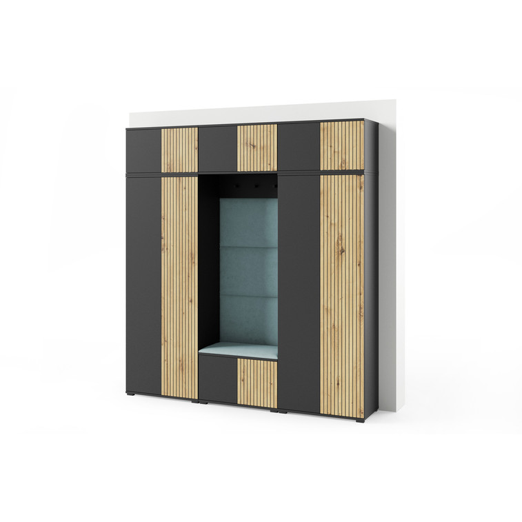 Moderní předsíňová stěna je praktický prvek do vstupních prostor vašeho domu. Předsíňová stěna obsahuje čalouněné panely, které se montují přímo na stěnu za pomoci lepidla. Potah panelů je tkanina Trinity. Bezúchytková čela dvířek zajišťují pohodlné používání - systém TIP-ON  otvírá se jemným zatlačením na čelo dvířek.
