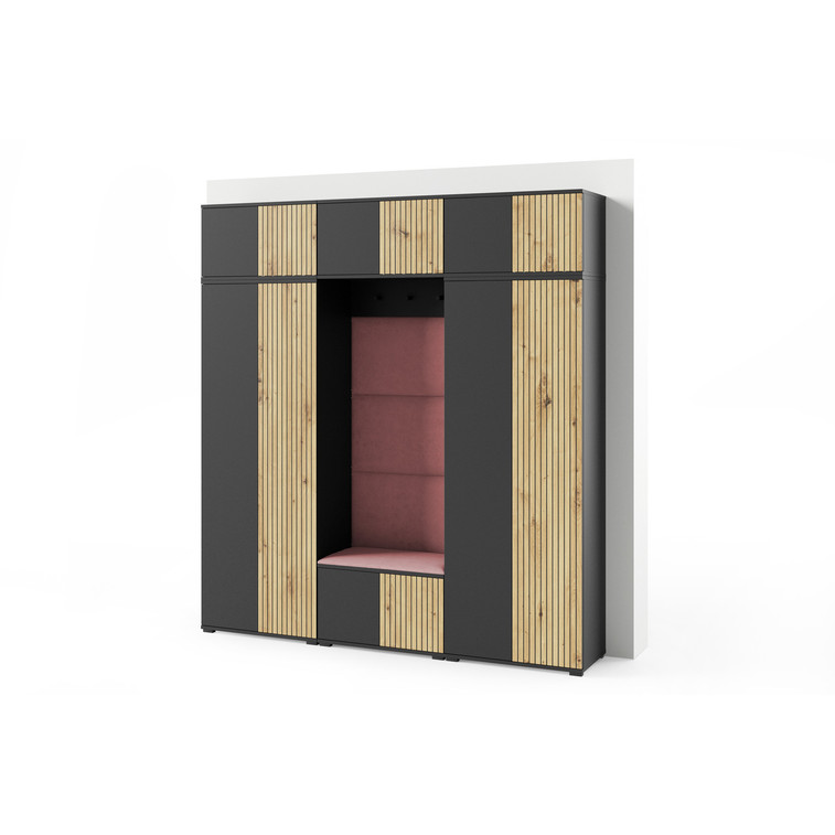 Moderní předsíňová stěna je praktický prvek do vstupních prostor vašeho domu. Předsíňová stěna obsahuje čalouněné panely, které se montují přímo na stěnu za pomoci lepidla. Potah panelů je tkanina Trinity. Bezúchytková čela dvířek zajišťují pohodlné používání - systém TIP-ON  otvírá se jemným zatlačením na čelo dvířek.