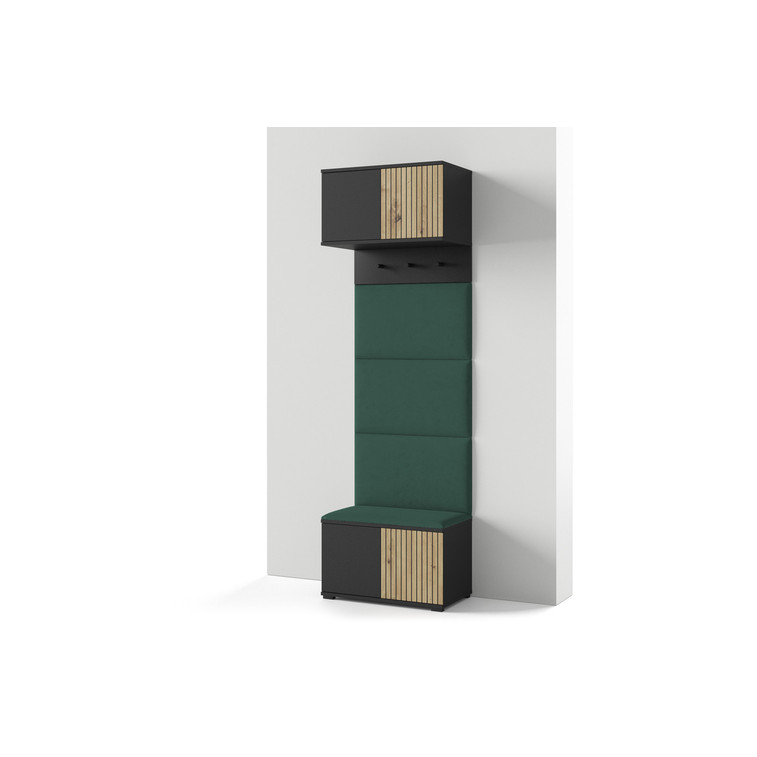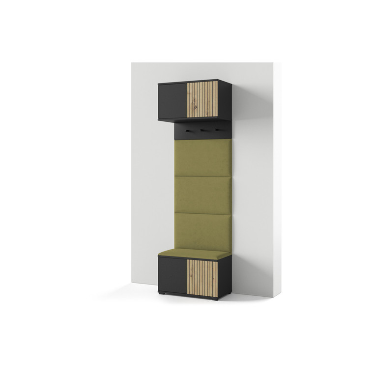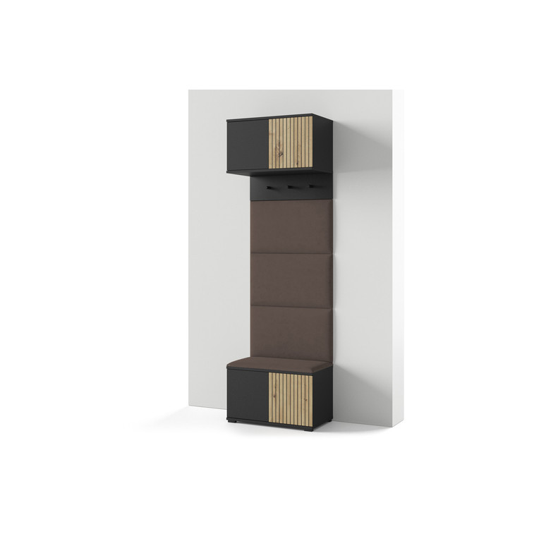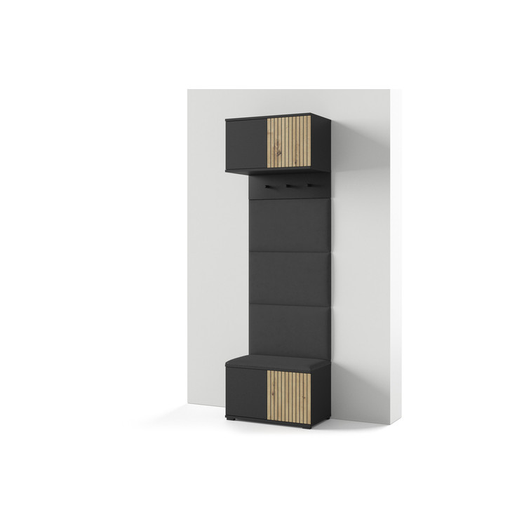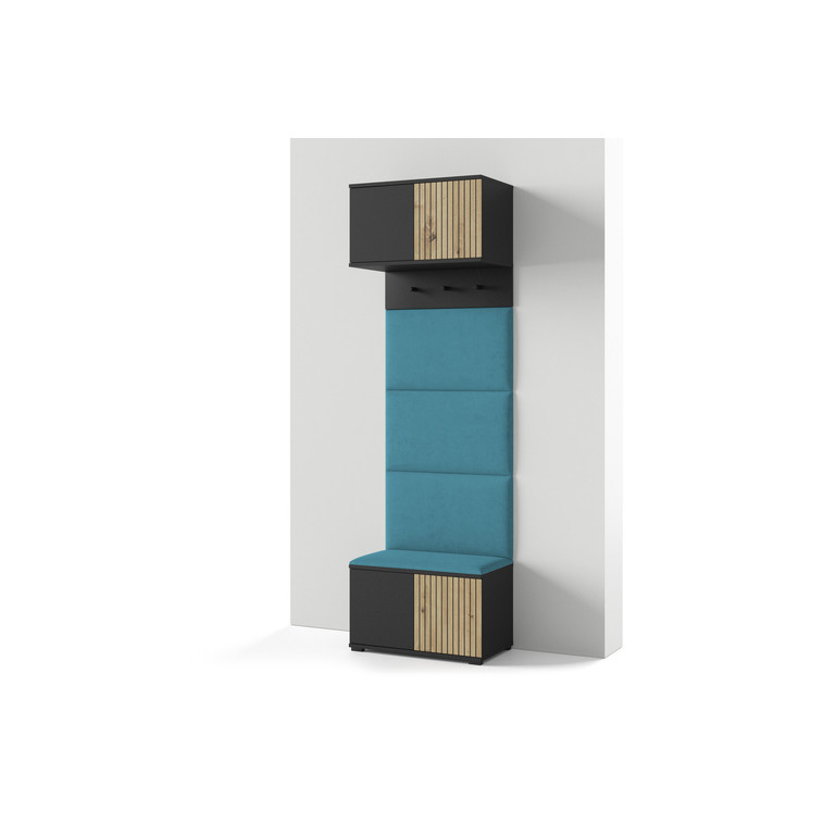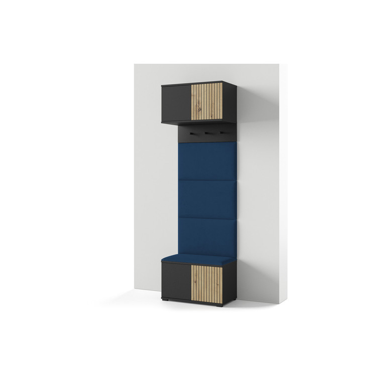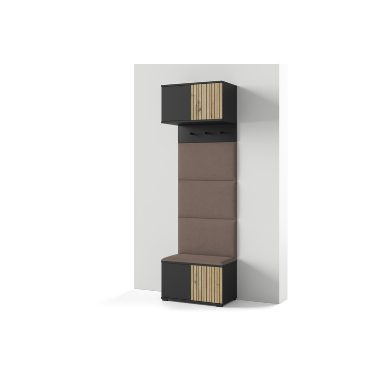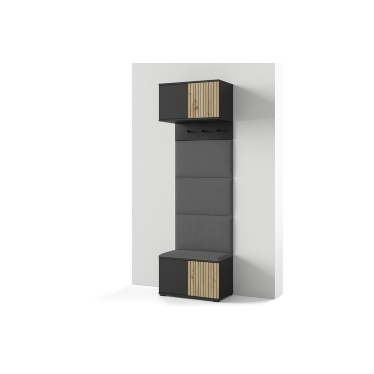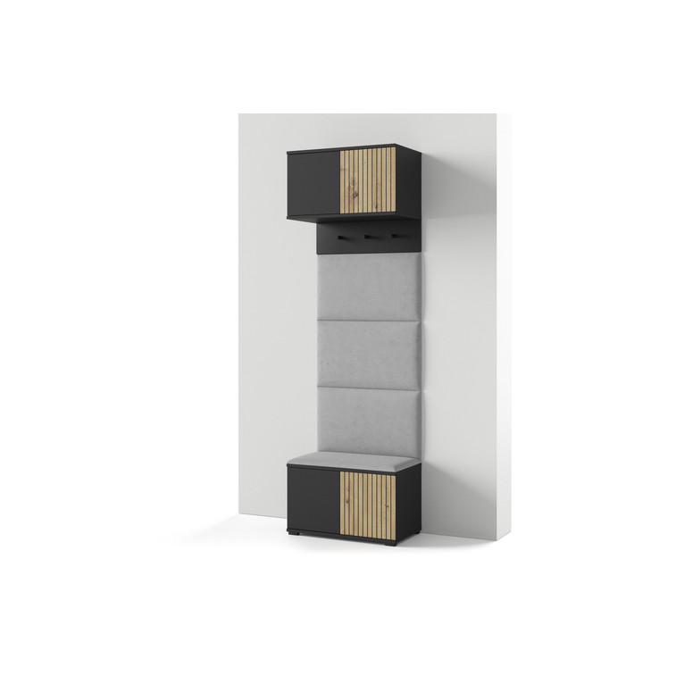 Moderní předsíňová stěna je praktický prvek do vstupních prostor vašeho domu. Předsíňová stěna obsahuje čalouněné panely, které se montují přímo na stěnu za pomoci lepidla. Potah panelů je tkanina Trinity. Bezúchytková čela dvířek zajišťují pohodlné používání - systém TIP-ON otvírá se jemným zatlačením na čelo dvířek.