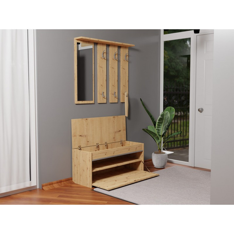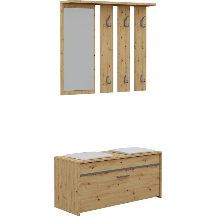 Funkční předsíňová stěna sestavená z věšáku, zrcadla a botníku.
