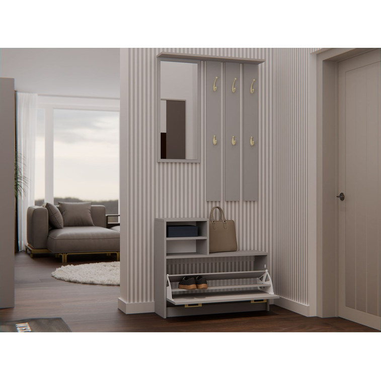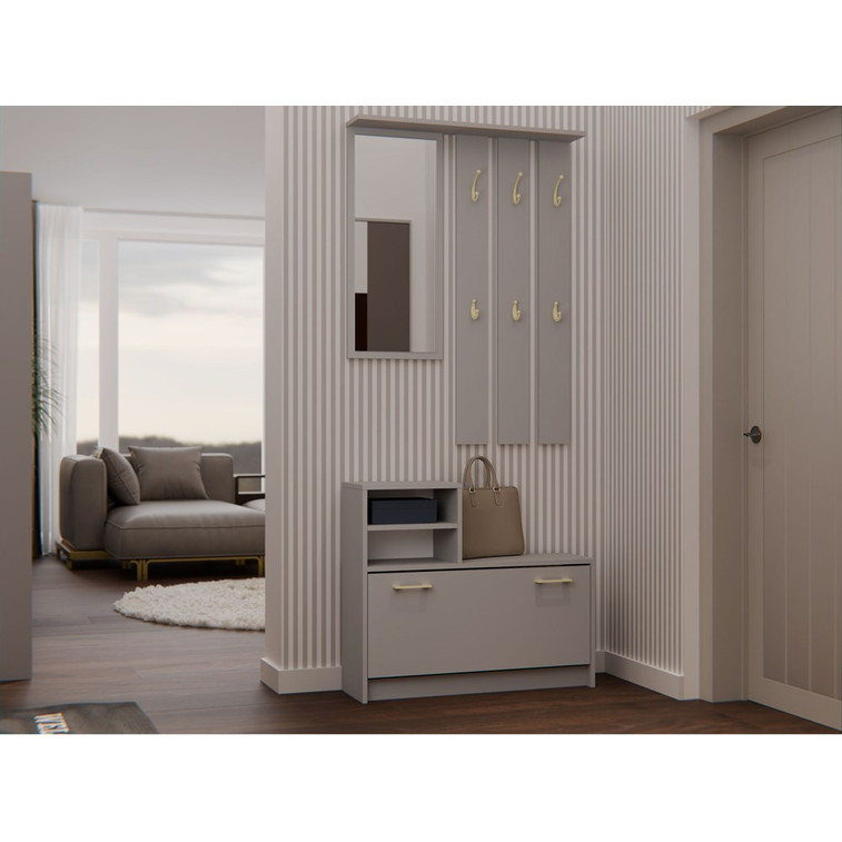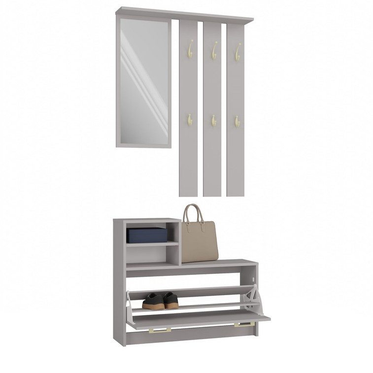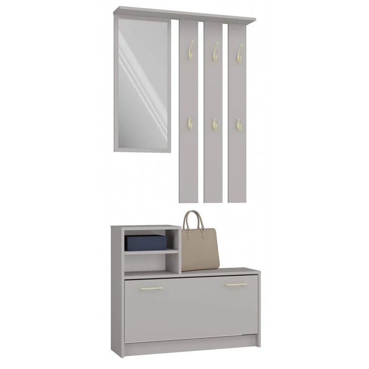 Věšák: Obsahuje šest věšáků na vaše oblečení. Výšku věšáku můžete nastavit dle vlastních potřeb. Hned vedle věšáku naleznete velké zrcadlo. Pod věšákem jsou dvě praktické police, do kterých se vám vejdou vaše doplňky, nebo dekorace.