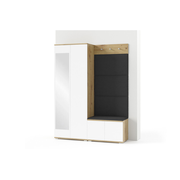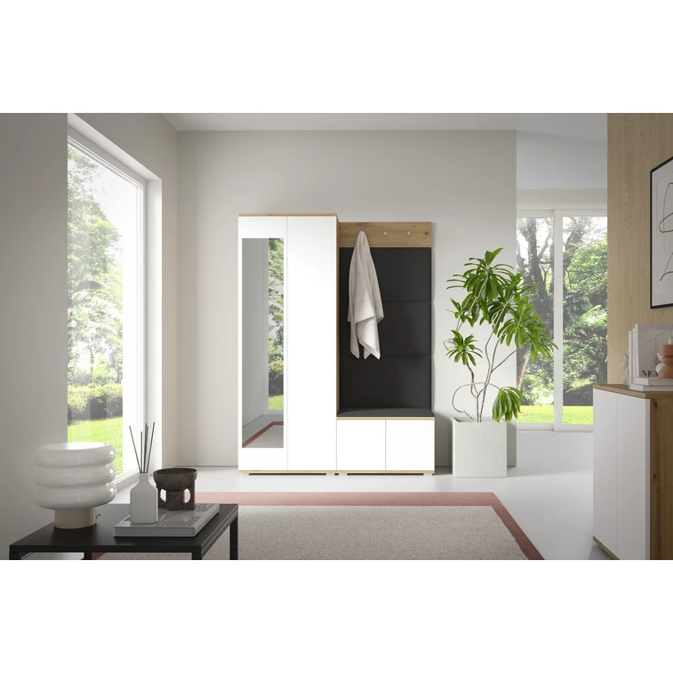 Je to praktický prvek do vstupních prostor vašeho domu. Předsíňová stěna obsahuje čalouněné panely, které se montují přímo na stěnu za pomoci lepidla. Potah panelů je tkanina Trinity. Předsíňová stěna se skládá z několika částí. Tato sada obsahuje: 1x šatní skříň, 1x botník, věšák, 4 panely.