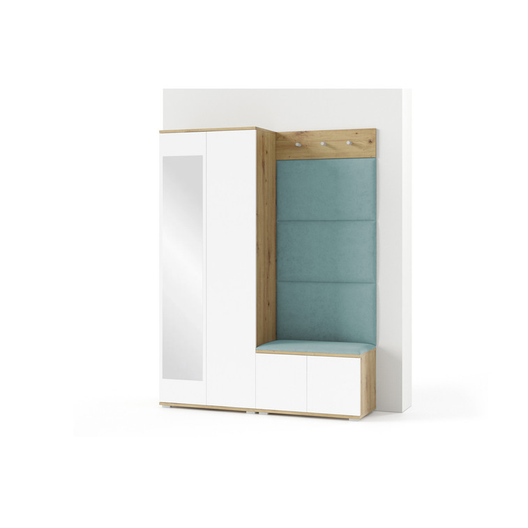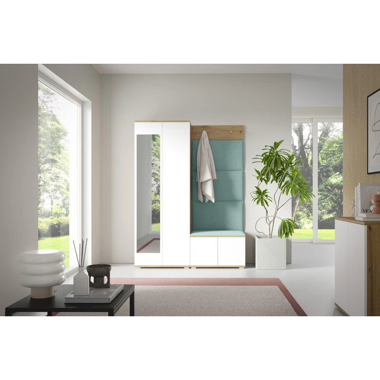 Je to praktický prvek do vstupních prostor vašeho domu. Předsíňová stěna obsahuje čalouněné panely, které se montují přímo na stěnu za pomoci lepidla. Potah panelů je tkanina Trinity. Předsíňová stěna se skládá z několika částí. Tato sada obsahuje: 1x šatní skříň, 1x botník, věšák, 4 panely.