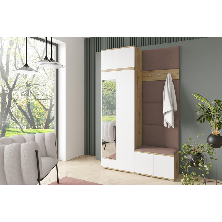 Je to praktický prvek do vstupních prostor vašeho domu. Předsíňová stěna obsahuje čalouněné panely, které se montují přímo na stěnu za pomoci lepidla. Potah panelů je tkanina Trinity. Předsíňová stěna se skládá z několika částí. Tato sada obsahuje: 1x šatní skříň, 1x nástavba, 1x botník, věšák, 5 panelů.
