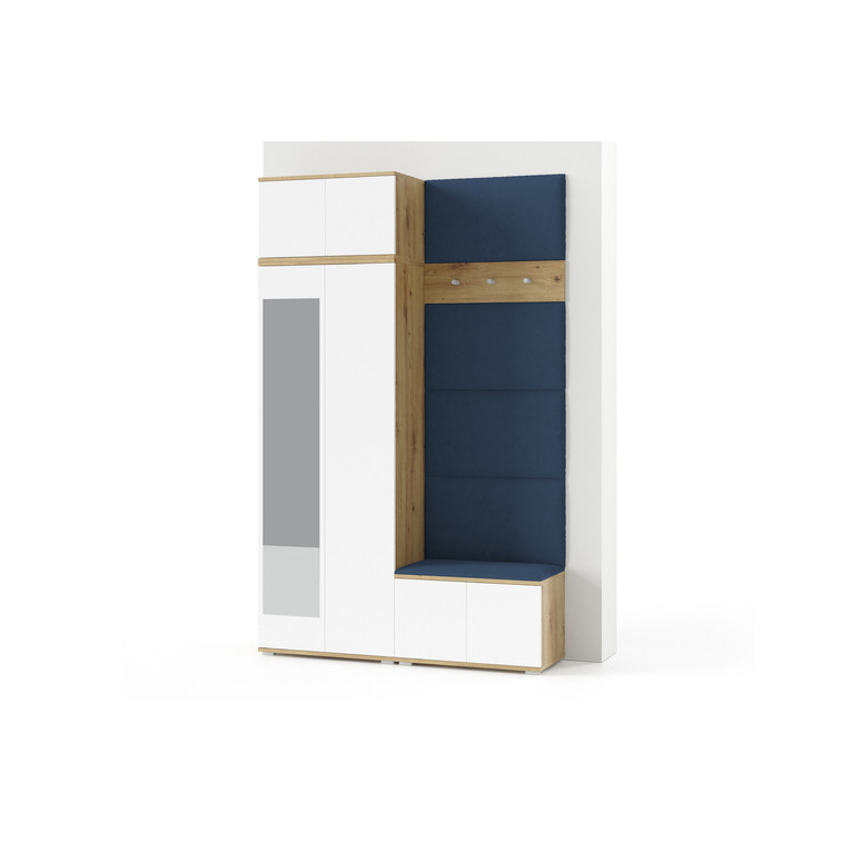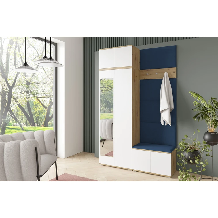 Je to praktický prvek do vstupních prostor vašeho domu. Předsíňová stěna obsahuje čalouněné panely, které se montují přímo na stěnu za pomoci lepidla. Potah panelů je tkanina Trinity. Předsíňová stěna se skládá z několika částí. Tato sada obsahuje: 1x šatní skříň, 1x nástavba, 1x botník, věšák, 5 panelů.