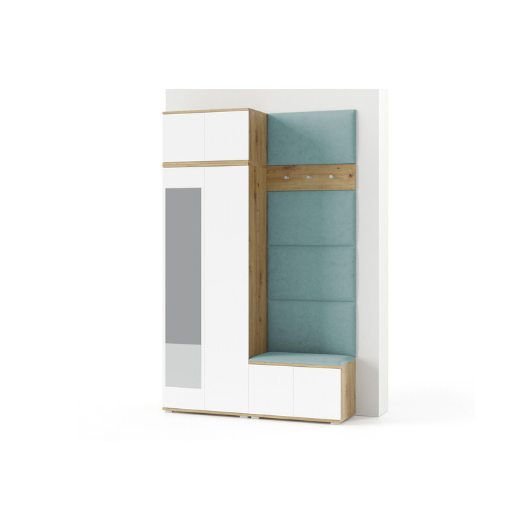 Je to praktický prvek do vstupních prostor vašeho domu. Předsíňová stěna obsahuje čalouněné panely, které se montují přímo na stěnu za pomoci lepidla. Potah panelů je tkanina Trinity. Předsíňová stěna se skládá z několika částí. Tato sada obsahuje: 1x šatní skříň, 1x nástavba, 1x botník, věšák, 5 panelů.