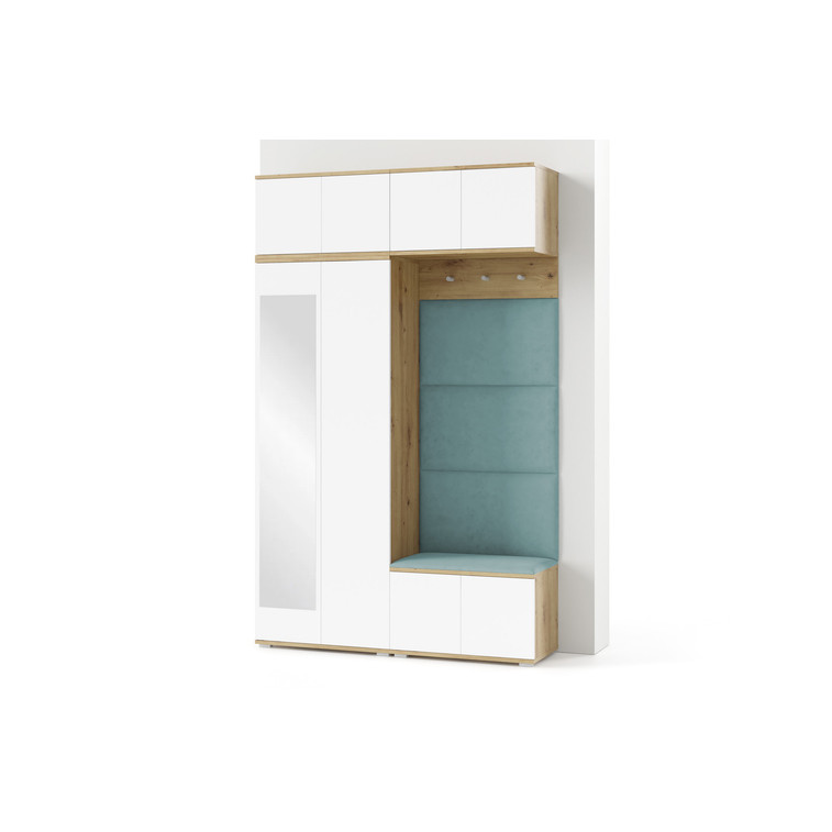 Je to praktický prvek do vstupních prostor vašeho domu. Předsíňová stěna obsahuje čalouněné panely, které se montují přímo na stěnu za pomoci lepidla. Potah panelů je tkanina Trinity. Předsíňová stěna se skládá z několika částí. Tato sada obsahuje: 1x šatní skříň, 1x nástavba, 1x závěsná skříňka, 1x botník, věšák, 4 panely.