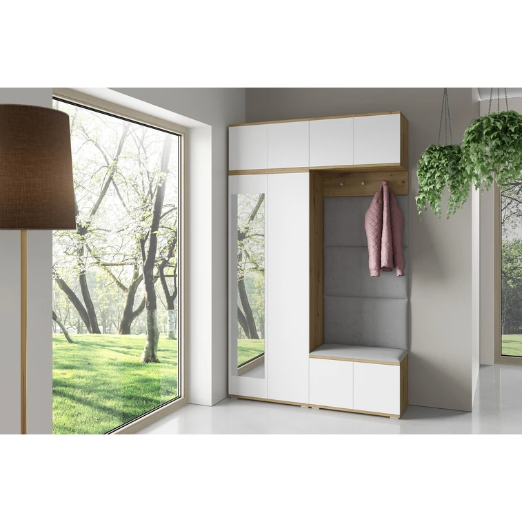 Je to praktický prvek do vstupních prostor vašeho domu. Předsíňová stěna obsahuje čalouněné panely, které se montují přímo na stěnu za pomoci lepidla. Potah panelů je tkanina Trinity. Předsíňová stěna se skládá z několika částí. Tato sada obsahuje: 1x šatní skříň, 1x nástavba, 1x závěsná skříňka, 1x botník, věšák, 4 panely.