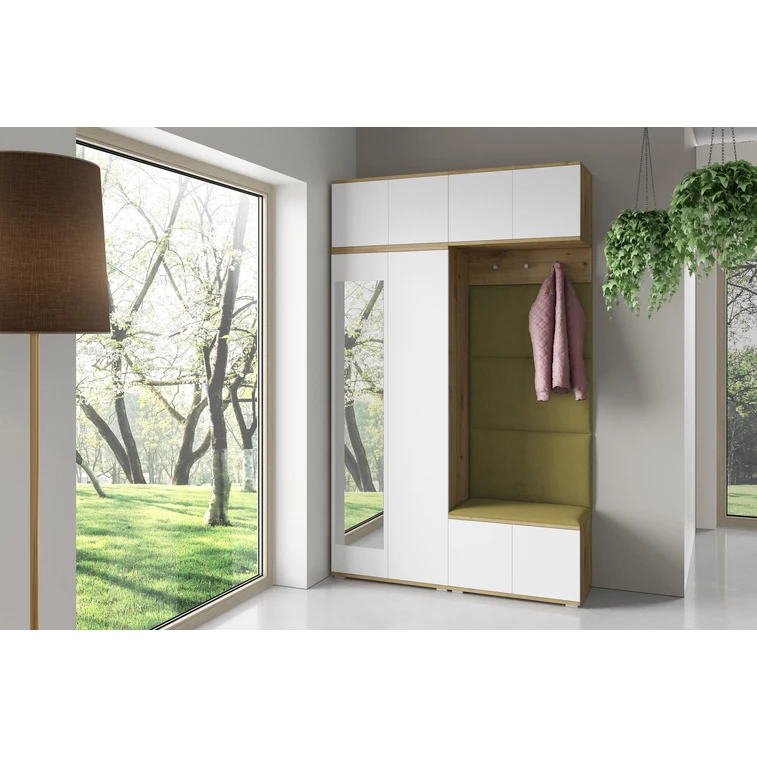 Je to praktický prvek do vstupních prostor vašeho domu. Předsíňová stěna obsahuje čalouněné panely, které se montují přímo na stěnu za pomoci lepidla. Potah panelů je tkanina Trinity. Předsíňová stěna se skládá z několika částí. Tato sada obsahuje: 1x šatní skříň, 1x nástavba, 1x závěsná skříňka, 1x botník, věšák, 4 panely.