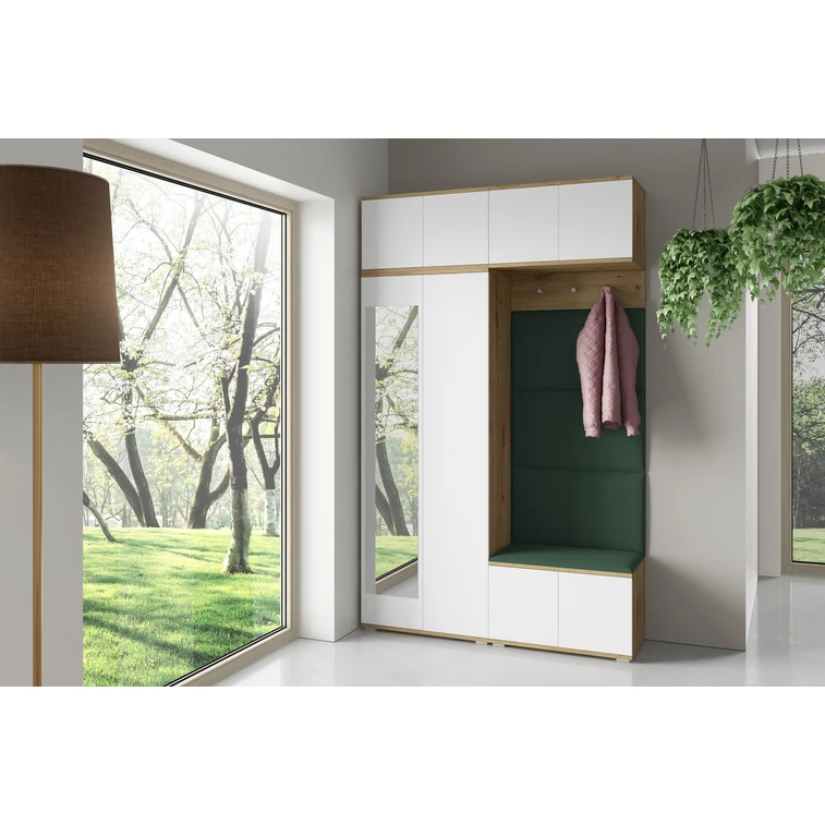 Je to praktický prvek do vstupních prostor vašeho domu. Předsíňová stěna obsahuje čalouněné panely, které se montují přímo na stěnu za pomoci lepidla. Potah panelů je tkanina Trinity. Předsíňová stěna se skládá z několika částí. Tato sada obsahuje: 1x šatní skříň, 1x nástavba, 1x závěsná skříňka, 1x botník, věšák, 4 panely.
