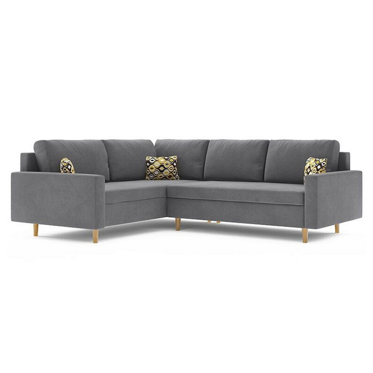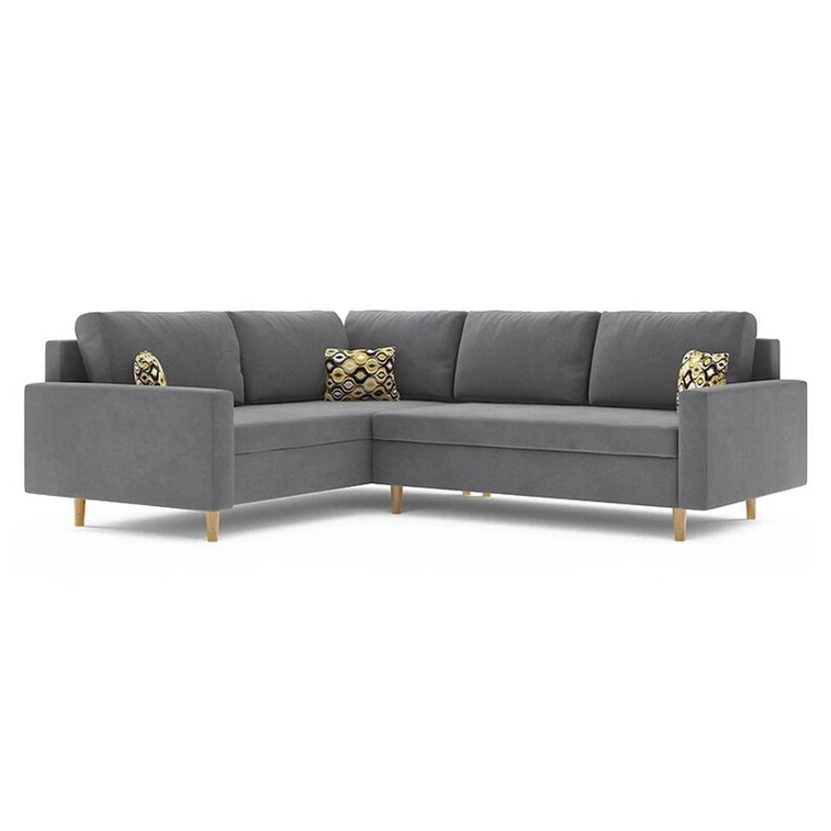 Pevná konstrukce ze dřeva a OSB desky. Potah z kvalitní látky VELUR - MICRO v moderních barevných odstínech. Možnost zvolení levé nebo pravé varianty. Snadné rozkládání pohovky na lůžkovou podobu. Moderní skandinávský design vhodný do všech současných interiérů. Sedací souprava má 2 úložné prostory pod sedáky.