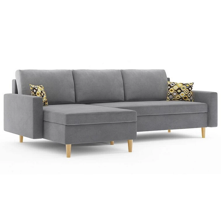 Pevná konstrukce ze dřeva a OSB desky. Potah z kvalitní látky Haiti v moderních barevných odstínech. Možnost zvolení levé nebo pravé varianty. Snadné rozkládání pohovky na lůžkovou podobu. Moderní skandinávský design vhodný do všech současných interiérů. Sedací souprava má 2 úložné prostory pod sedáky.