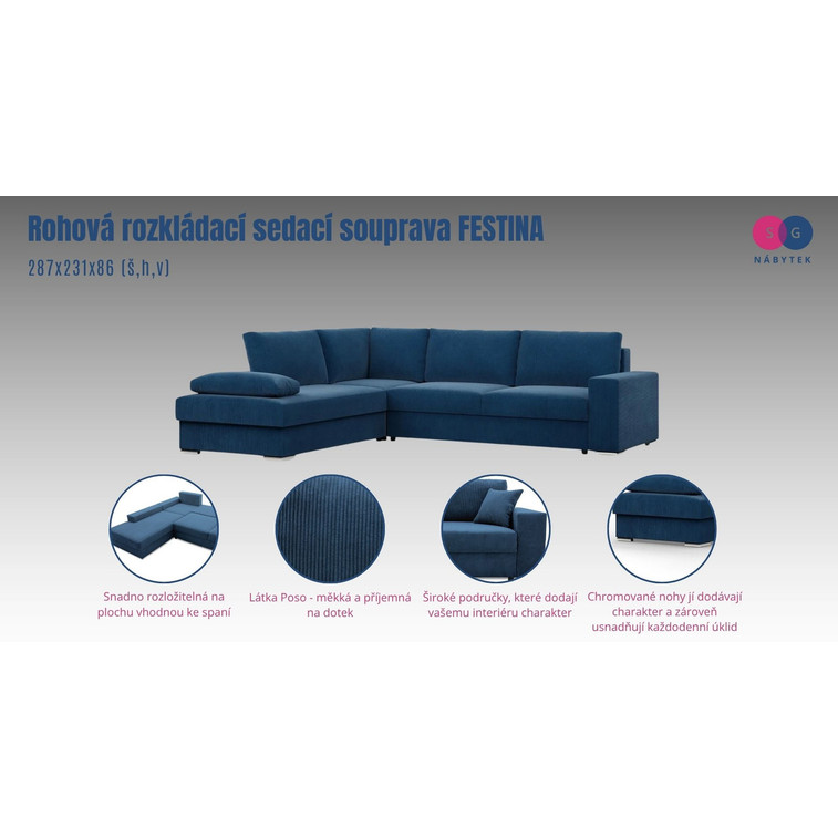 Pevná konstrukce ze dřeva a OSB desky. Potah z kvalitní látky POSO v mnoha moderních barevných odstínech. Snadné rozkládání na lůžkovou podobu. Moderní design vhodný do všech současných interiérů.
