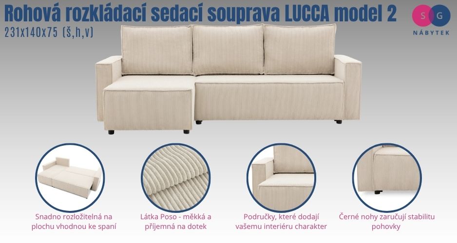 Moderní rohová sedací souprava LUCCA 2 je navržena v minimalistickém stylu. Poslouží jako prostorné místo pro pohodlný odpočinek. Snadno ji rozložíte a užijete si velkou plochu vhodnou na spaní.