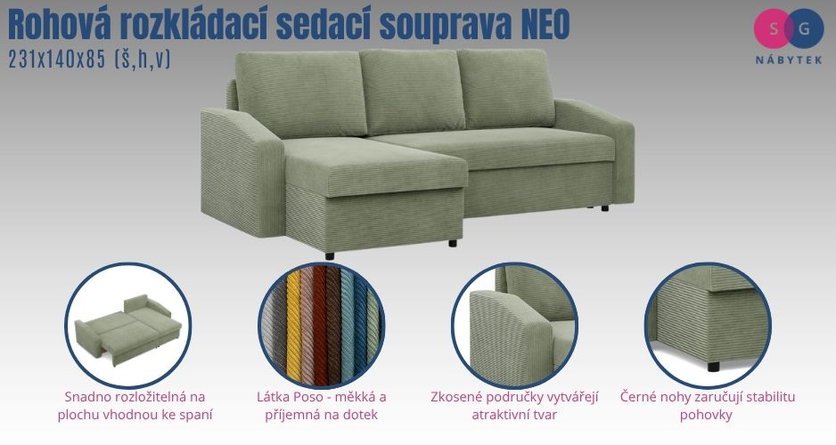 Sedací souprava NEO je moderní a stylový kus nábytku, který byl navržen s ohledem na lidi kteří oceňují pohodlí a funkčnost. Je vyrobena z pevných, vysoce kvalitních materiálů. Nohy jsou vyrobeny z plastu.