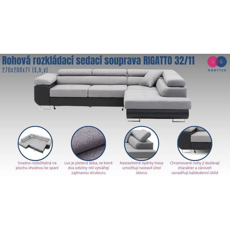 Rohová rozkládací sedací souprava Rigatto 32/11. Pevná konstrukce ze dřeva a OSB desky. Potah z kvalitní eko-kůže a tkaniny. Nastavitelné opěrky hlavy umožňují nastavit úhel sklonu ve vztahu ke krku a hlavě uživatele, což poskytuje dodatečnou podporu a zároveň maximální pohodlí . Pochromované efektní nožičky usnadní úklid a  systém rozkládání typu delfín rychle a snadno promění sedací soupravu na lůžko. Moderní design vhodný do všech současných interiérů.