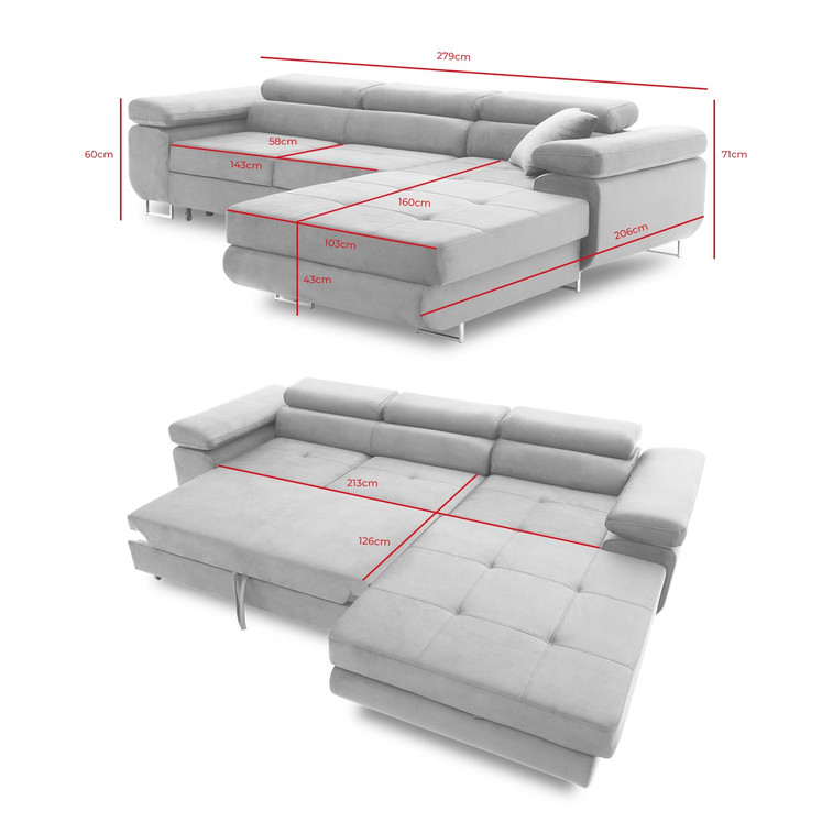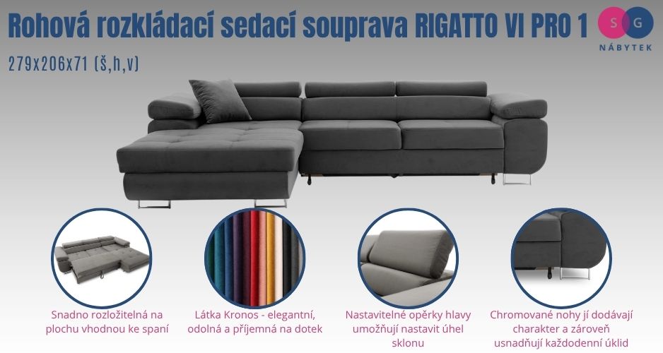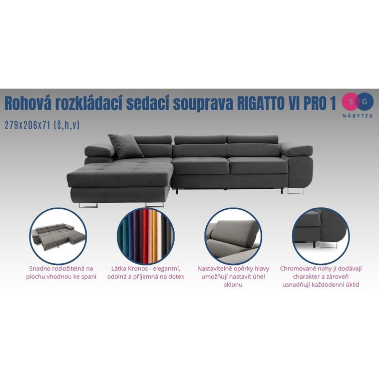 Rohová rozkládací sedací souprava RIGATTO VI PRO 1. Poslouží jako prostorné místo pro pohodlný odpočinek. Snadno ji rozložíte a užijete si velkou plochu vhodnou na spaní.