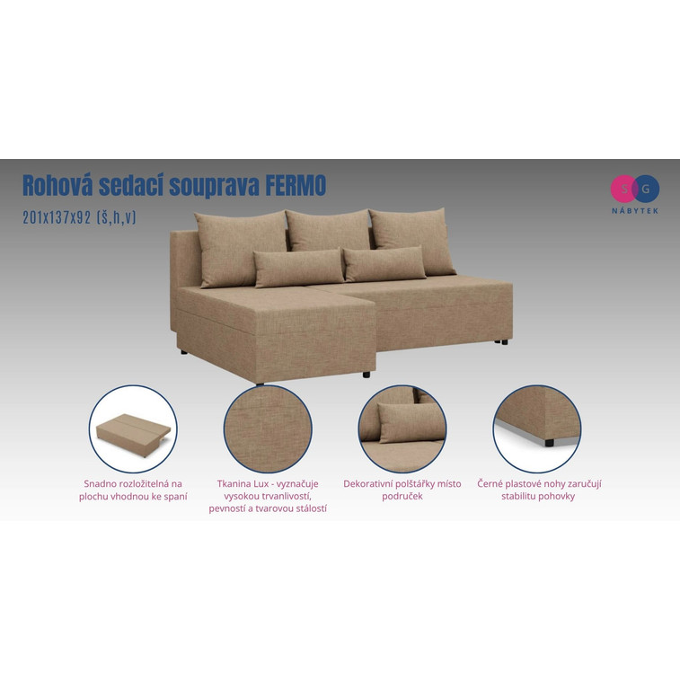 Pevná konstrukce ze dřeva a OSB desky. Potah z kvalitní látky LUX v mnoha moderních barevných odstínech. Snadné rozkládání sedací soupravy na lůžkovou podobu. Moderní design vhodný do všech současných interiérů.