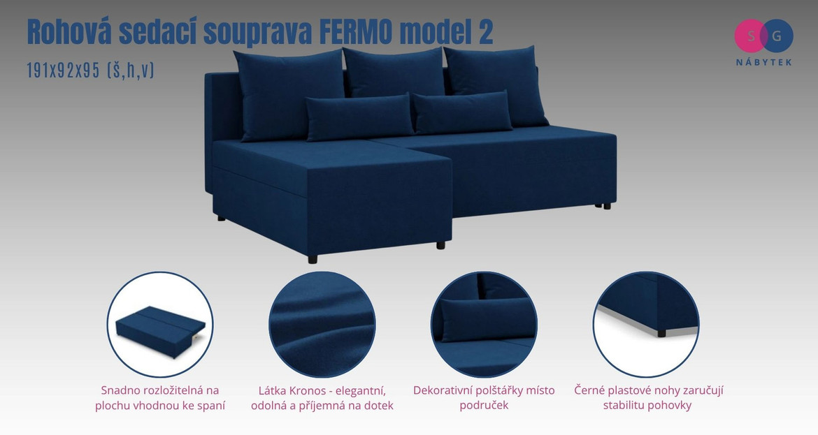 Pevná konstrukce ze dřeva a OSB desky. Potah z kvalitní látky v mnoha moderních barevných odstínech. Snadné rozkládání sedací soupravy na lůžkovou podobu. Moderní design vhodný do všech současných interiérů.