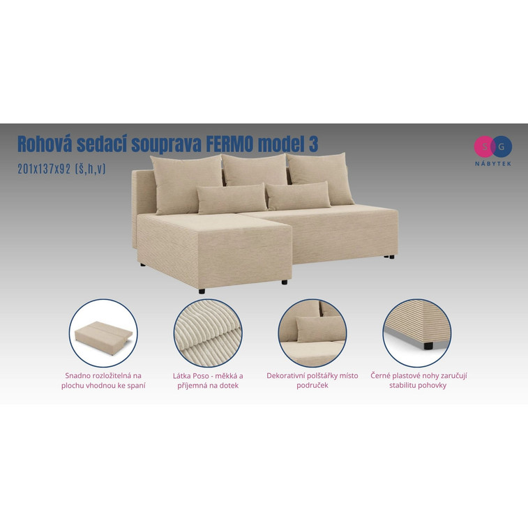 Pevná konstrukce ze dřeva a OSB desky. Potah z kvalitní látky Poso v mnoha moderních barevných odstínech. Snadné rozkládání sedací soupravy na lůžkovou podobu. Moderní design vhodný do všech současných interiérů.