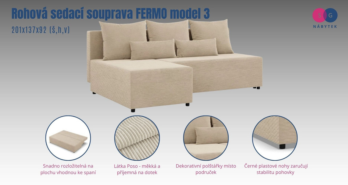 Pevná konstrukce ze dřeva a OSB desky. Potah z kvalitní látky Poso v mnoha moderních barevných odstínech. Snadné rozkládání sedací soupravy na lůžkovou podobu. Moderní design vhodný do všech současných interiérů.