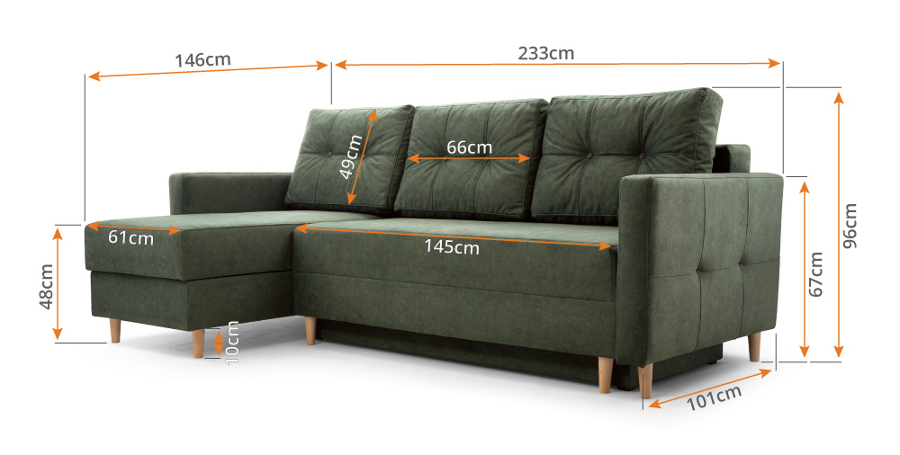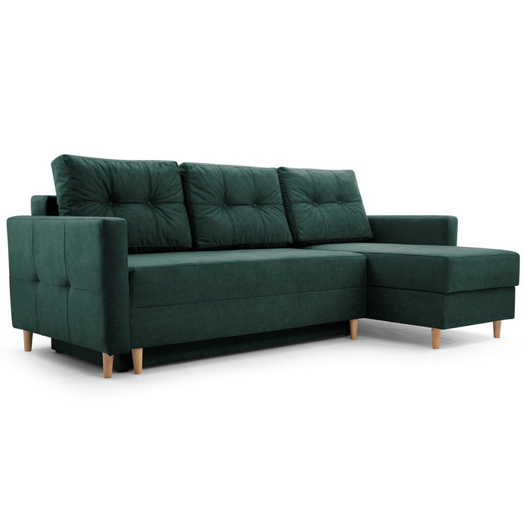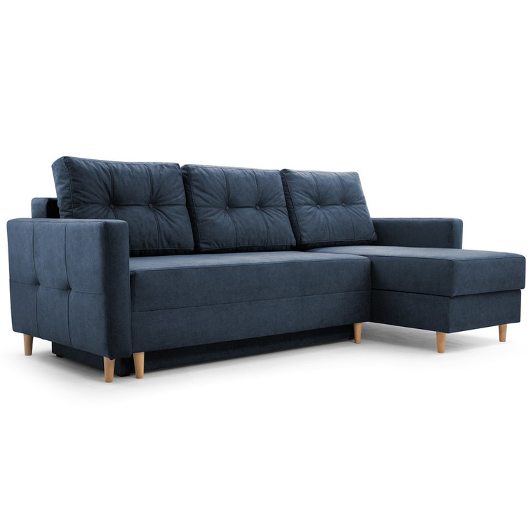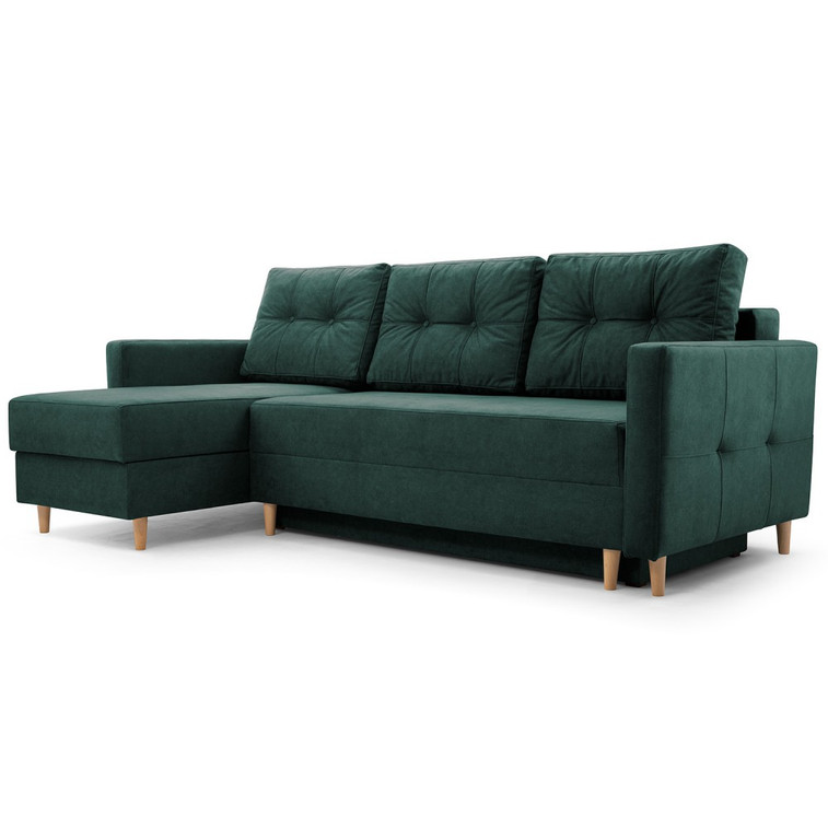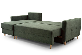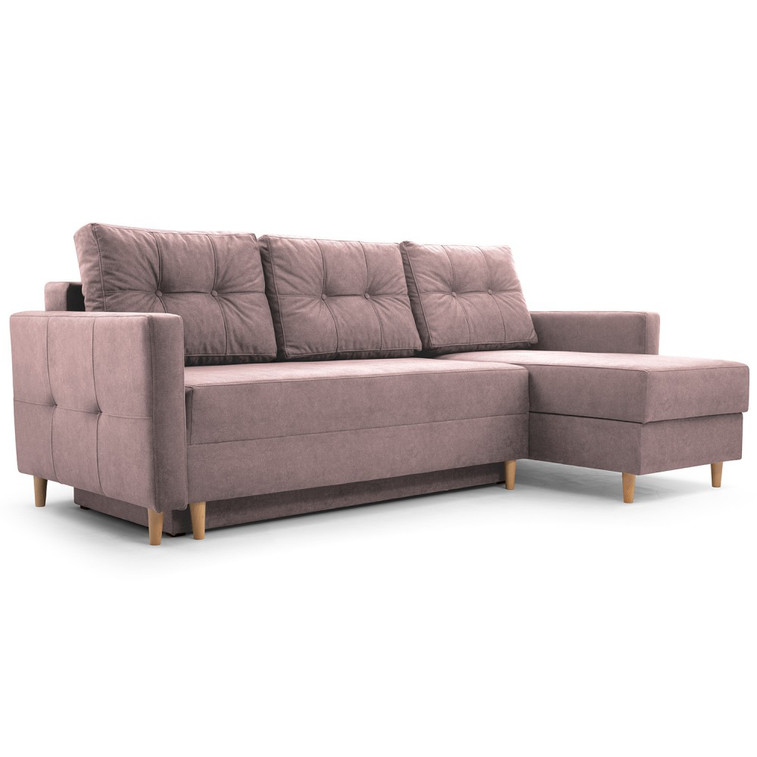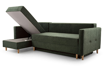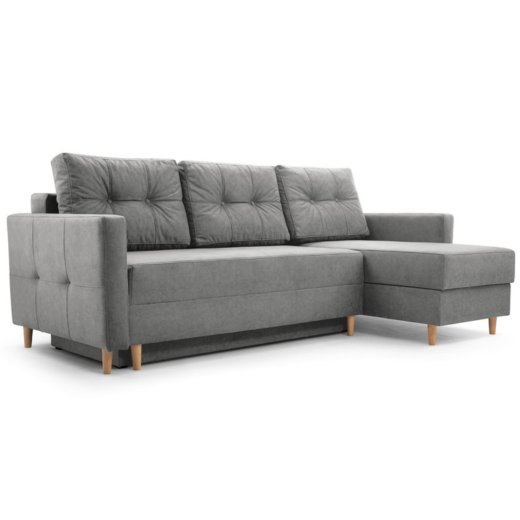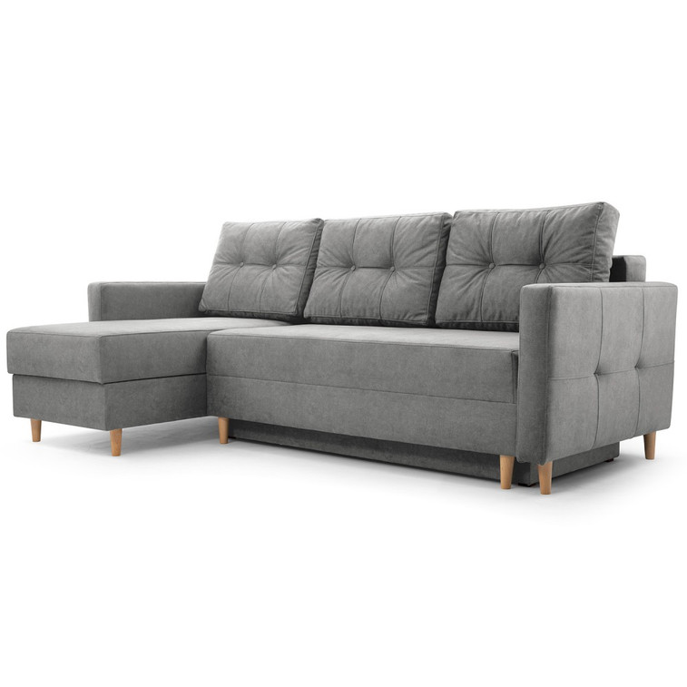 Rohová rozkládací sedací souprava Metro ve skandinávském stylu. Opěradlo sedací soupravy je vyplněno měkkými dvojitě prošívanými polštáři, které zajišťují pohodlí při používání. Tímto prošíváním jsou zdobeny i strany. Zadní strana sedací soupravy je potažena materiálem ladícím s barvou celku. Nohy jsou vyrobeny z masivního dřeva.