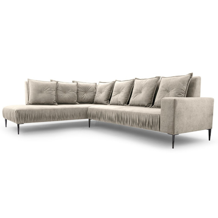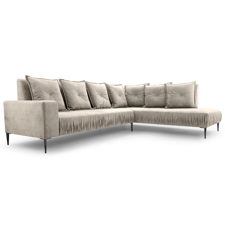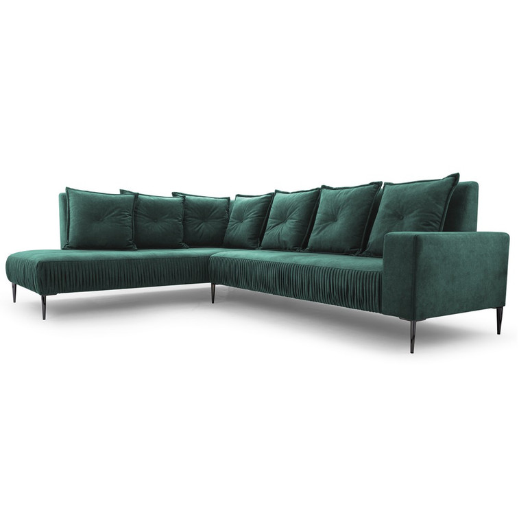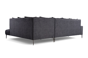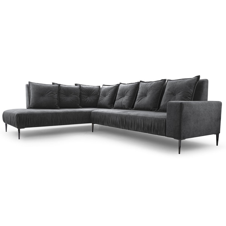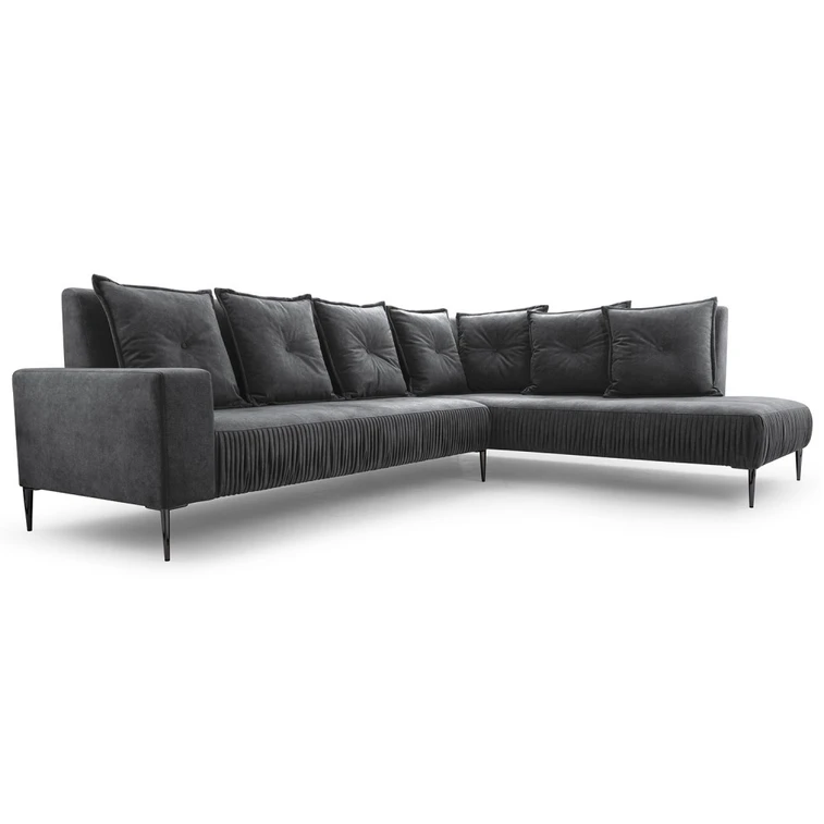 Rohová sedací souprava RINO je dostupná v zajímavých barvách. Černé jehlové nohy ji dodávají moderní styl. Zadní strana je potažena materiálem ladícím s barvou celku.