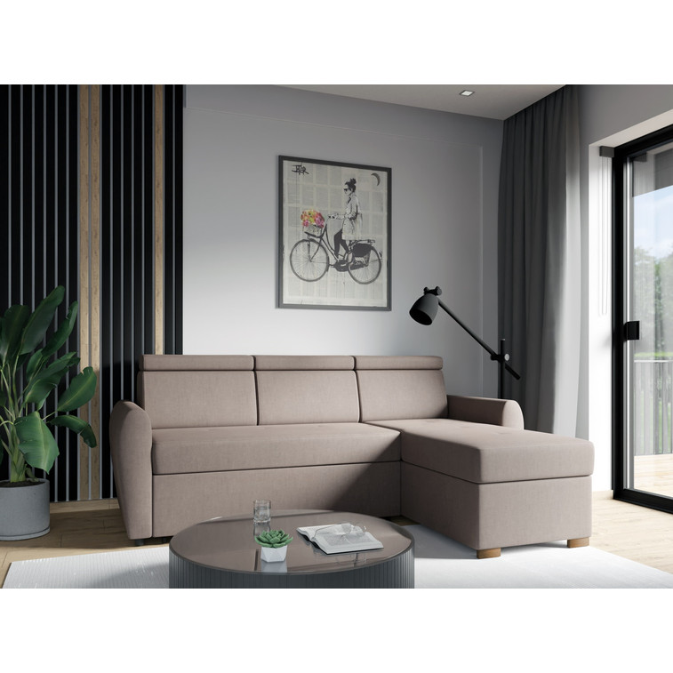 Pevná konstrukce ze dřeva a OSB desky. Potah z kvalitní látky Vogue v moderních barevných odstínech. Snadné rozkládání pohovky na lůžkovou podobu. Moderní skandinávský design vhodný do všech současných interiérů. Součástí pohovky je úložný prostor.